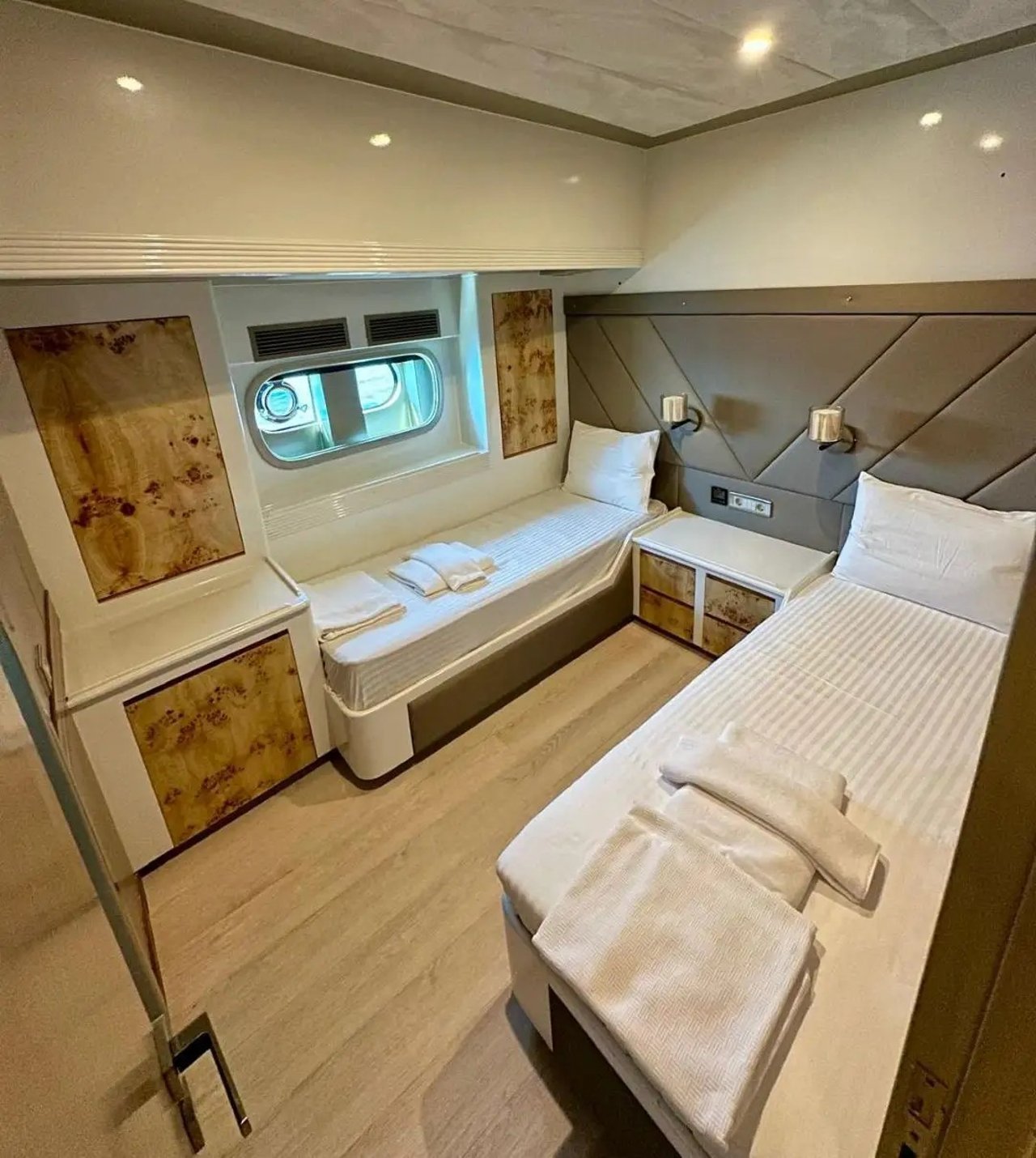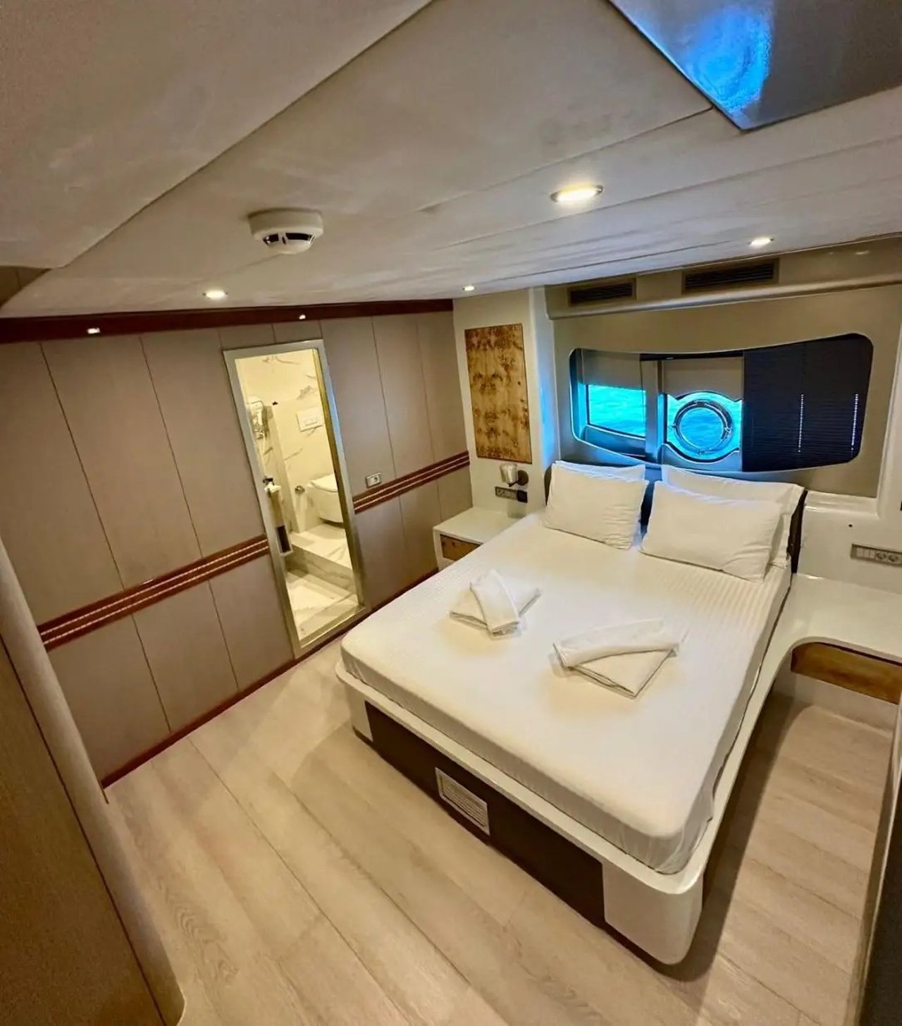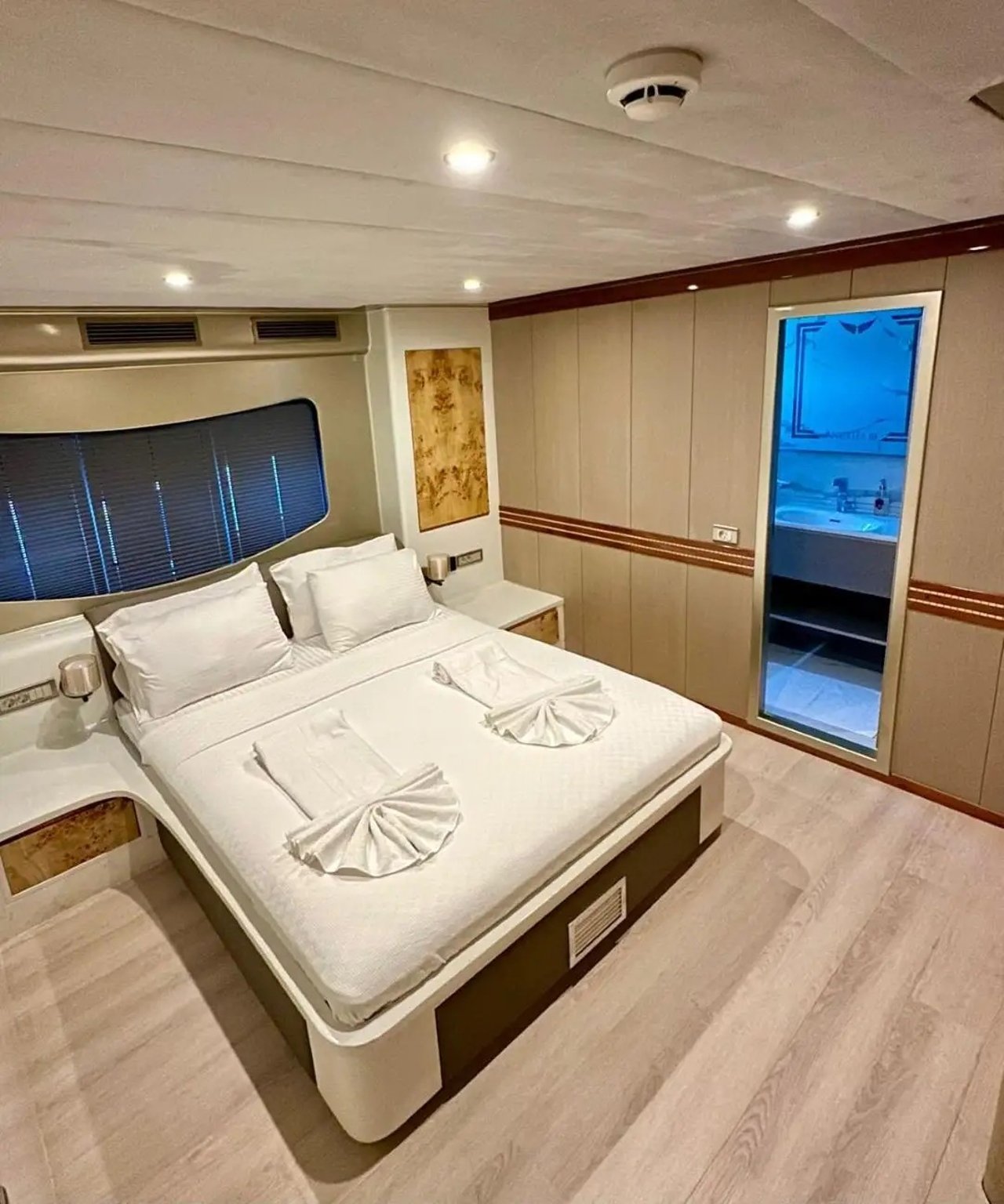 ANGELO III offers one of the most versatile layouts in her class, featuring seven well-appointed cabins that create rare flexibility for charter groups. Each suite is designed with soft neutral tones, rich wood finishes, and ensuite facilities to ensure restful privacy.
