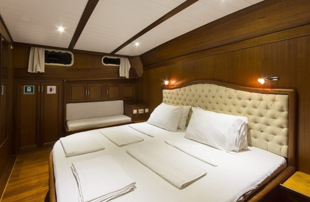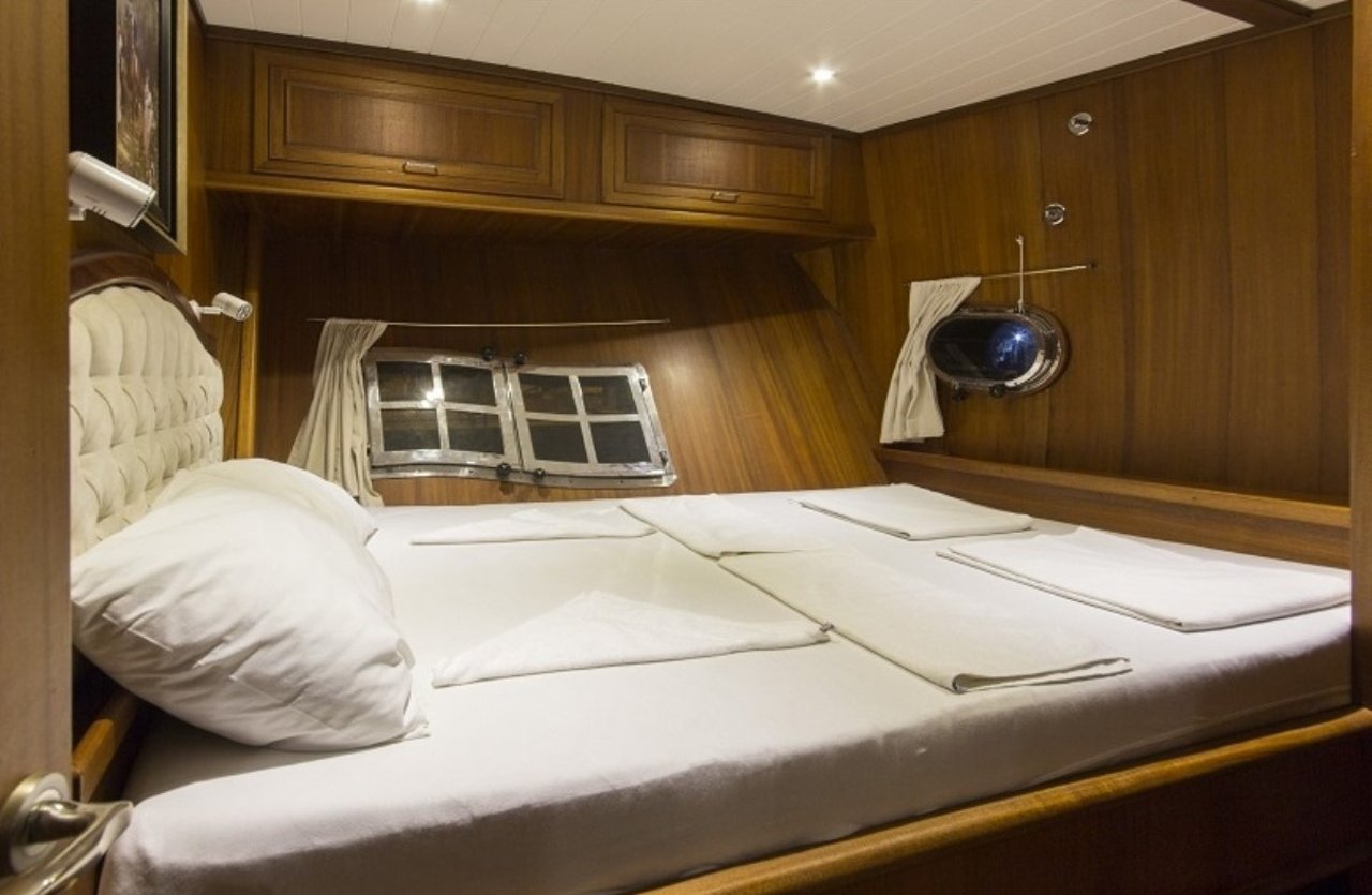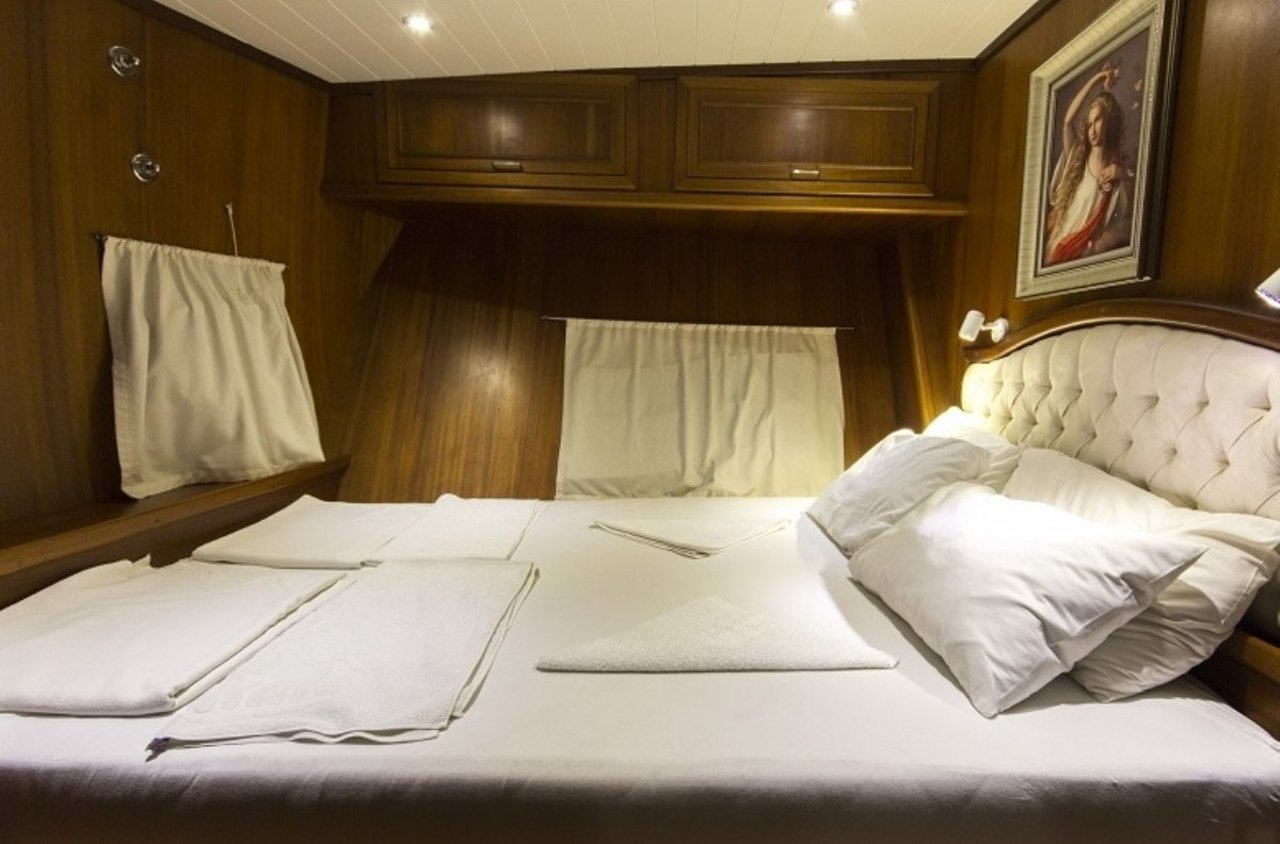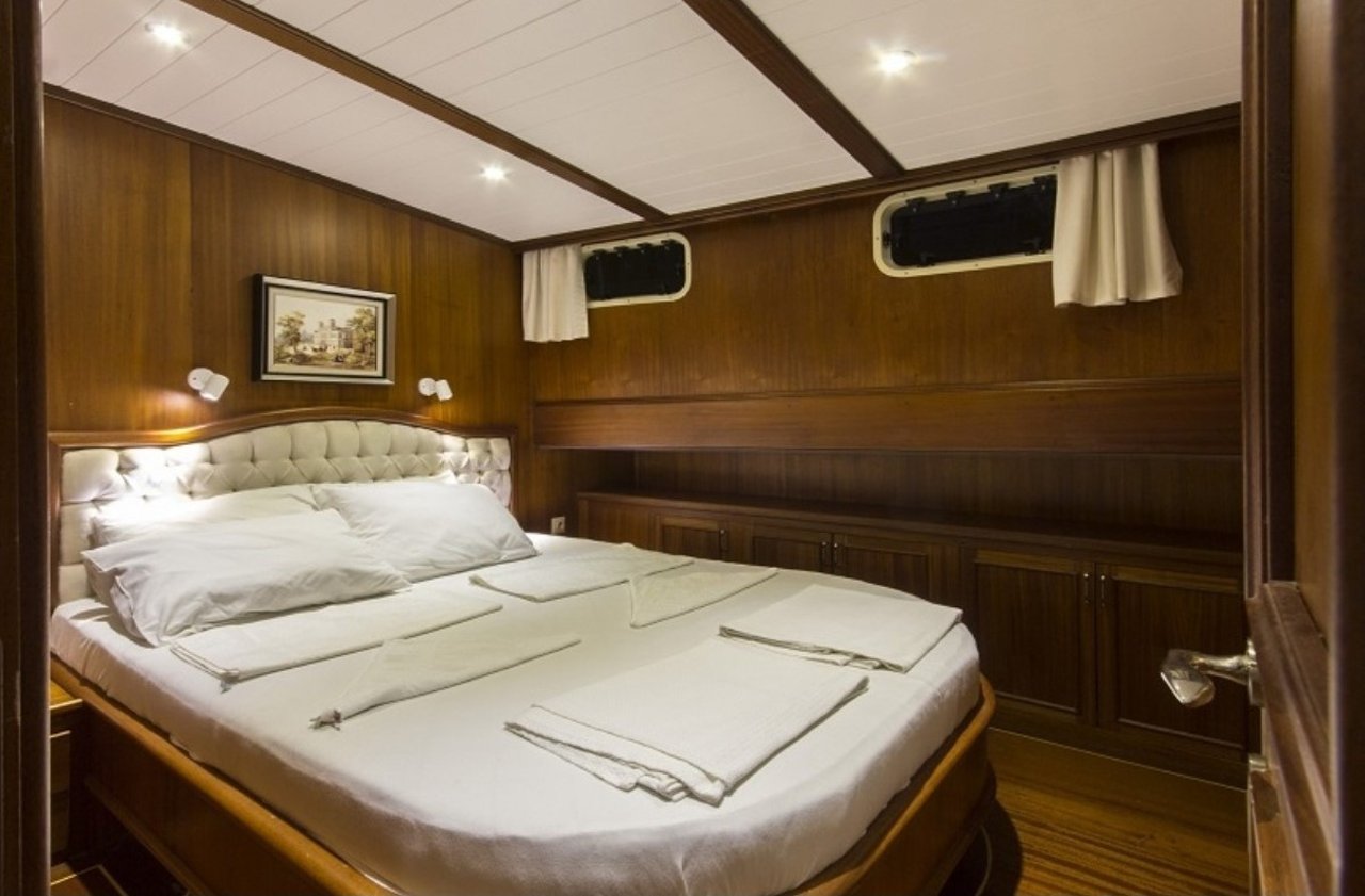 With a beam of 7.6m and a draft of 3.4m, CEMRE 4 is built for stability and smooth sailing. Designed as a classic gulet, she provides a comfortable cruising experience, whether gliding under sail or motoring between destinations. Her shallow draft allows access to quiet bays and secluded anchorages, creating the perfect setting for discovery along the Turkish Riviera.