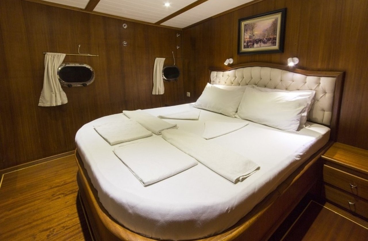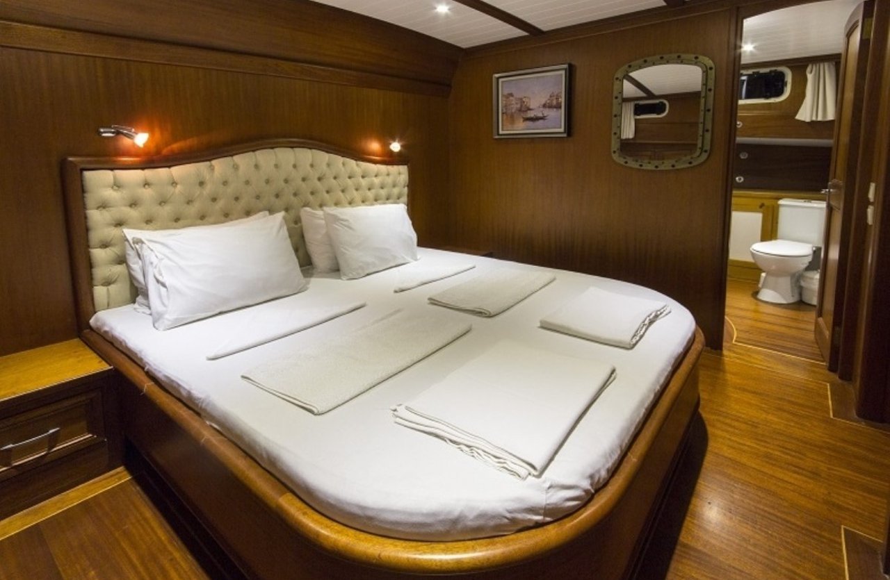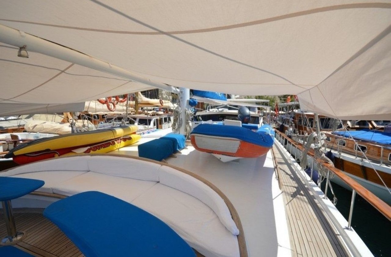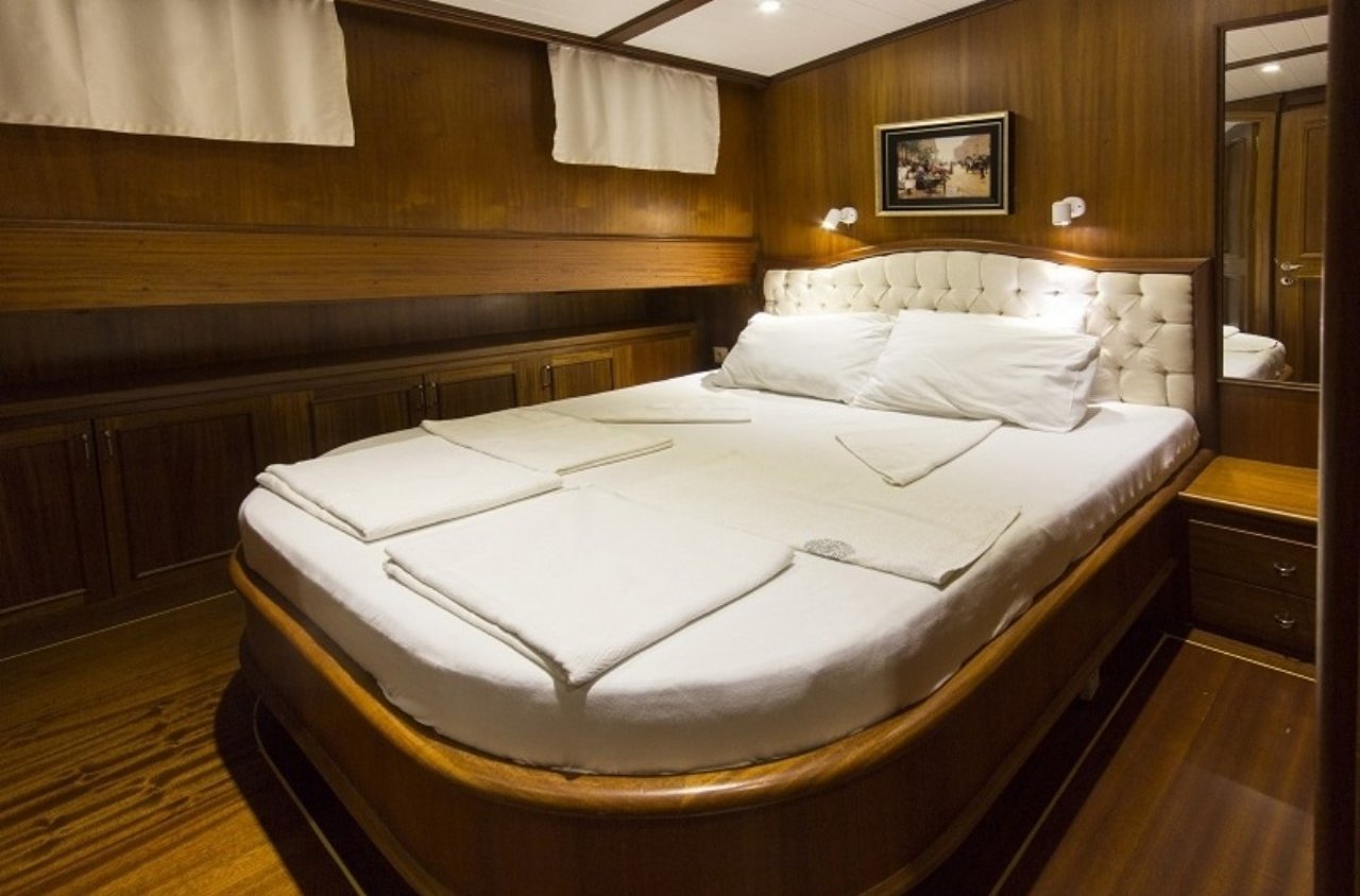 With a beam of 7.6m and a draft of 3.4m, CEMRE 4 is built for stability and smooth sailing. Designed as a classic gulet, she provides a comfortable cruising experience, whether gliding under sail or motoring between destinations. Her shallow draft allows access to quiet bays and secluded anchorages, creating the perfect setting for discovery along the Turkish Riviera.