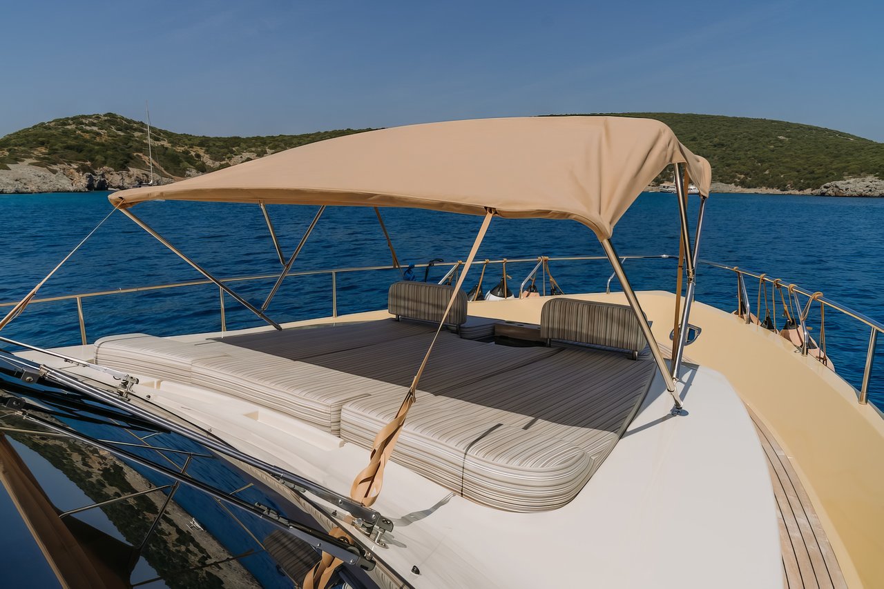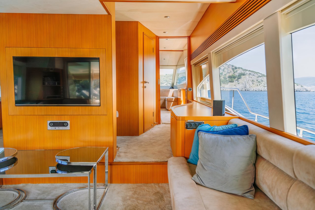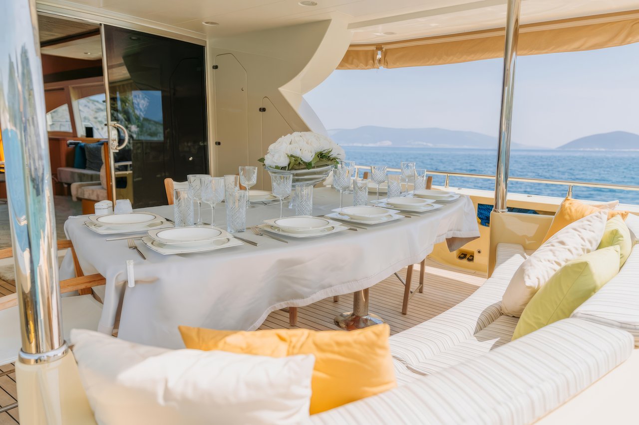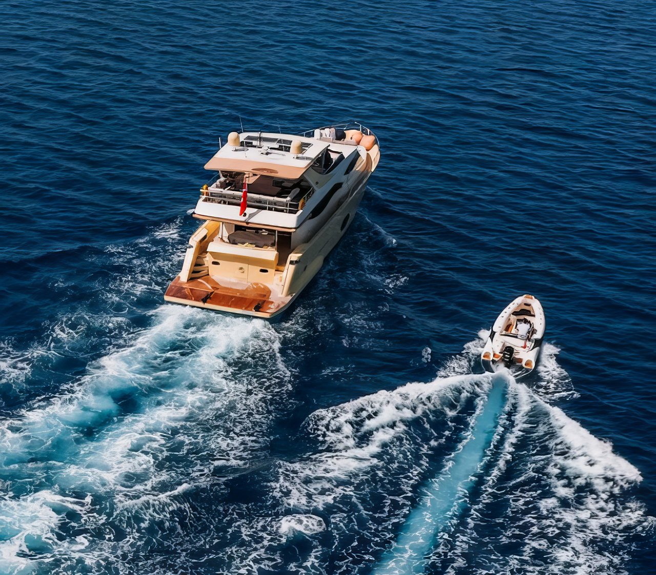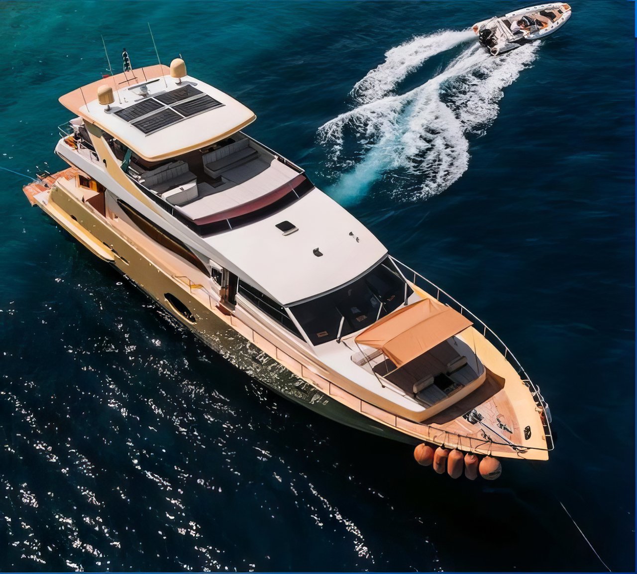 Streamlined 23.65m Tuzla Shipyard motor yacht • Accommodates up to 8 guests in 4 cabins • Two master suites for enhanced comfort • Expansive deck spaces for alfresco dining & lounging • Semi-displacement hull for speed and stability • Shallow 1.4m draft for access to secluded coves • Wide range of water toys for family fun