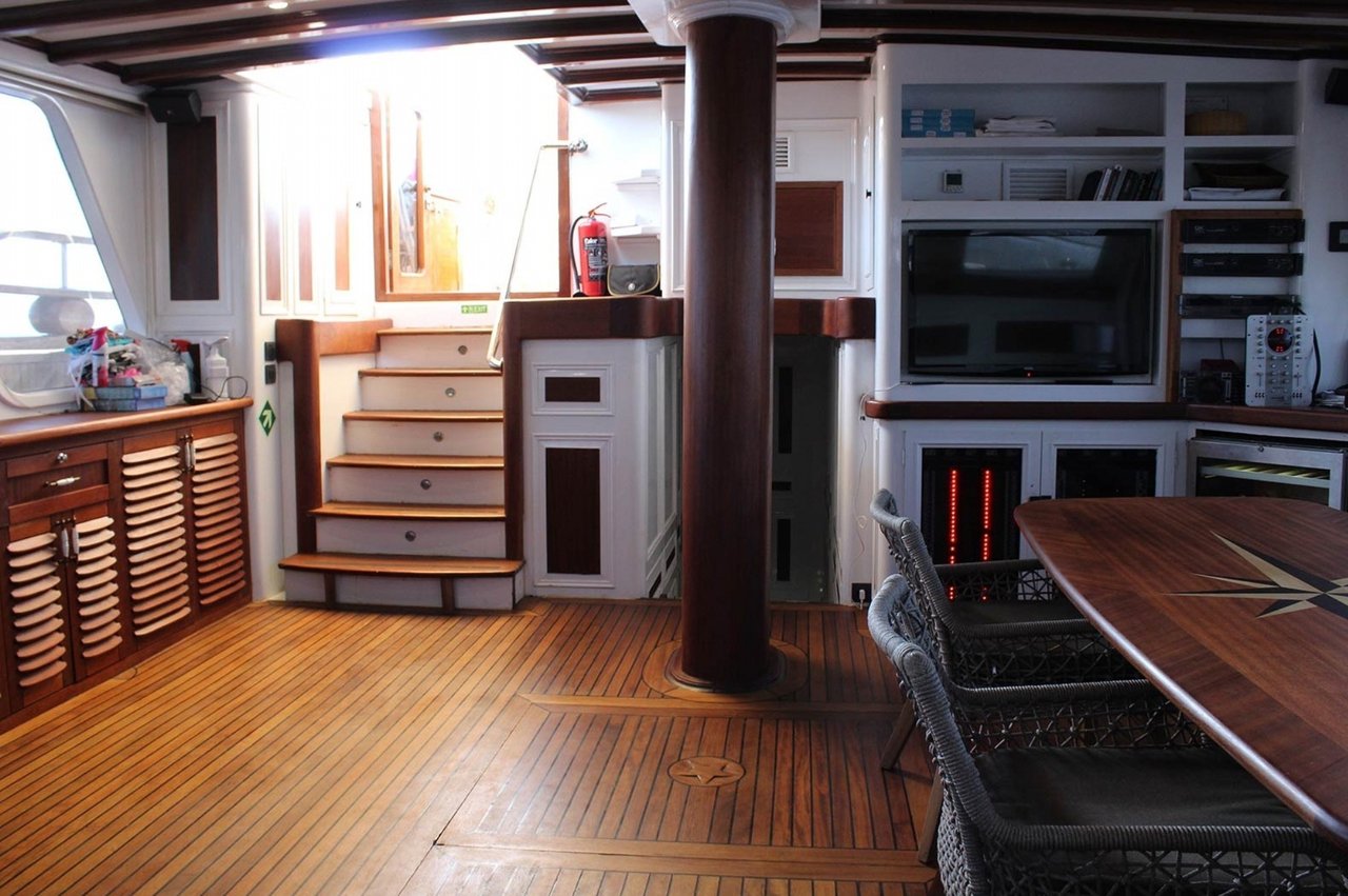 The interior of GRANDE MARE is a sanctuary of warmth and authenticity. Traditional Turkish craftsmanship meets modern amenities in the main salon, where soft lighting, wood panelling, and large windows create a cozy yet open space. Guests can relax in air-conditioned comfort, enjoy entertainment on the LCD TV, or listen to music via the CD stereo system.