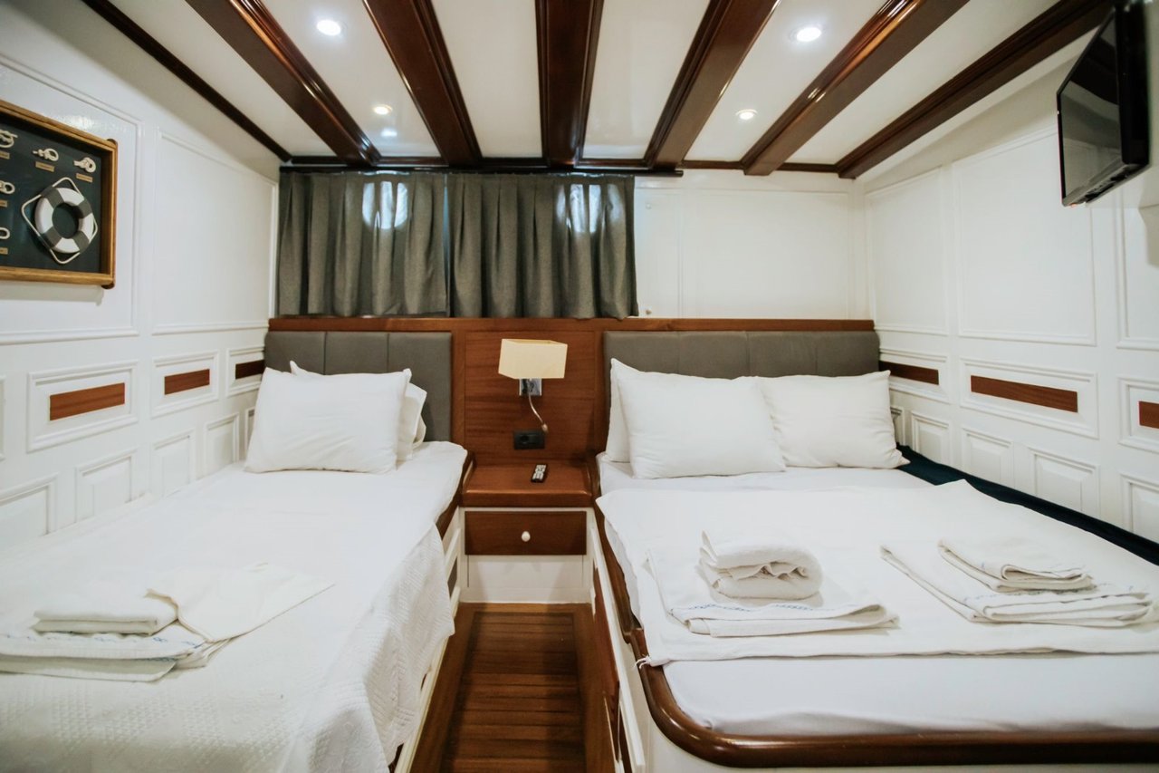 Each cabin features ensuite bathrooms, individual climate control, and refined interior styling, blending traditional wooden elements with modern elegance. Guests can expect a peaceful and private haven, perfect for relaxing after a day of sailing or exploring picturesque ports.