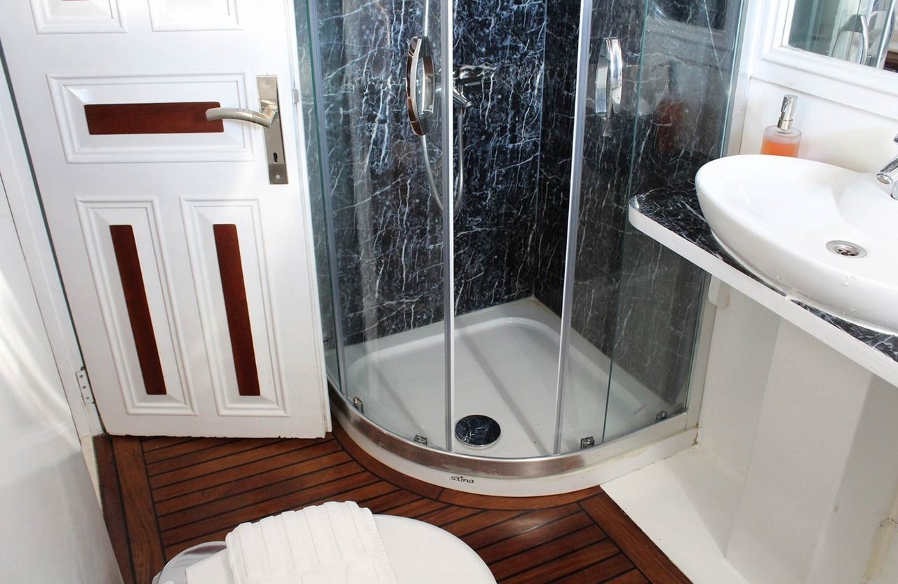 Traditional Gulet Design • Six Guest Cabins • Sleeps 12 Guests • Air Conditioning • Sun Deck with Sunbeds • LCD TV & CD Player • Freezer & Ice Machine • Coffee Machine • Sea Ladder • Deck Shower • Jet Ski • Waterskis • Kayaks • Snorkeling Gear • Professional 5-Crew Team