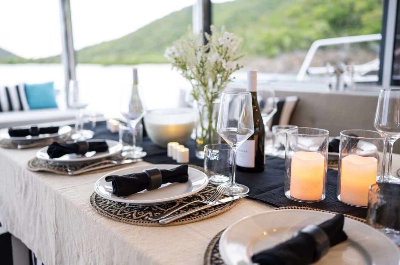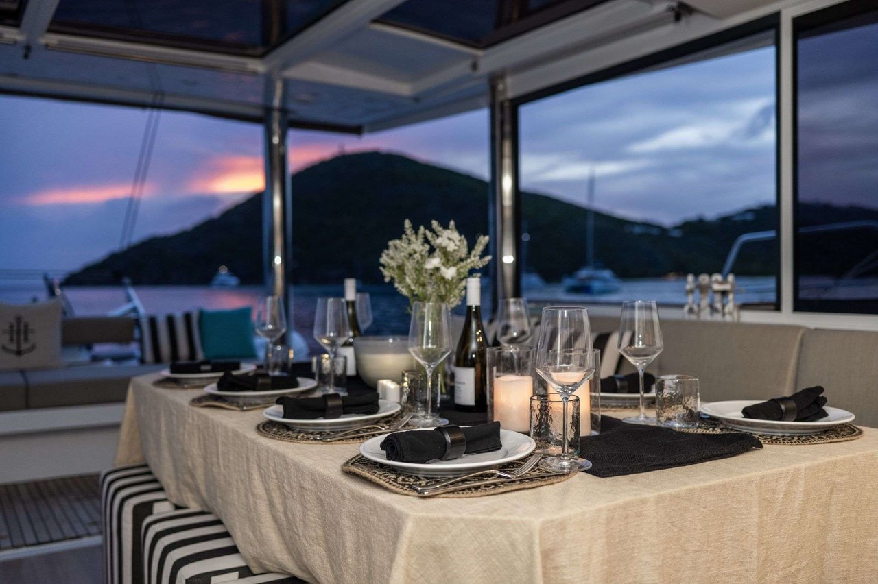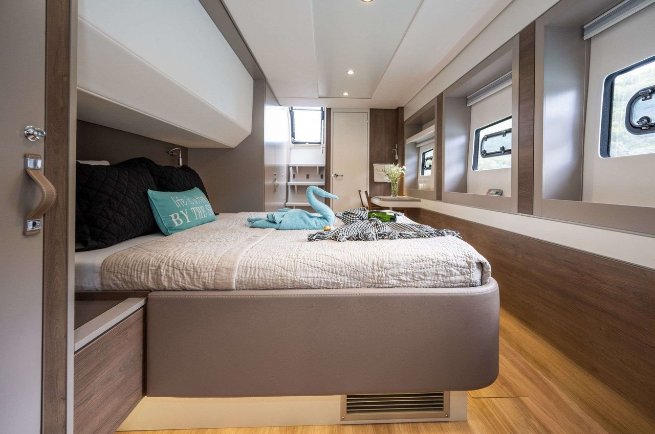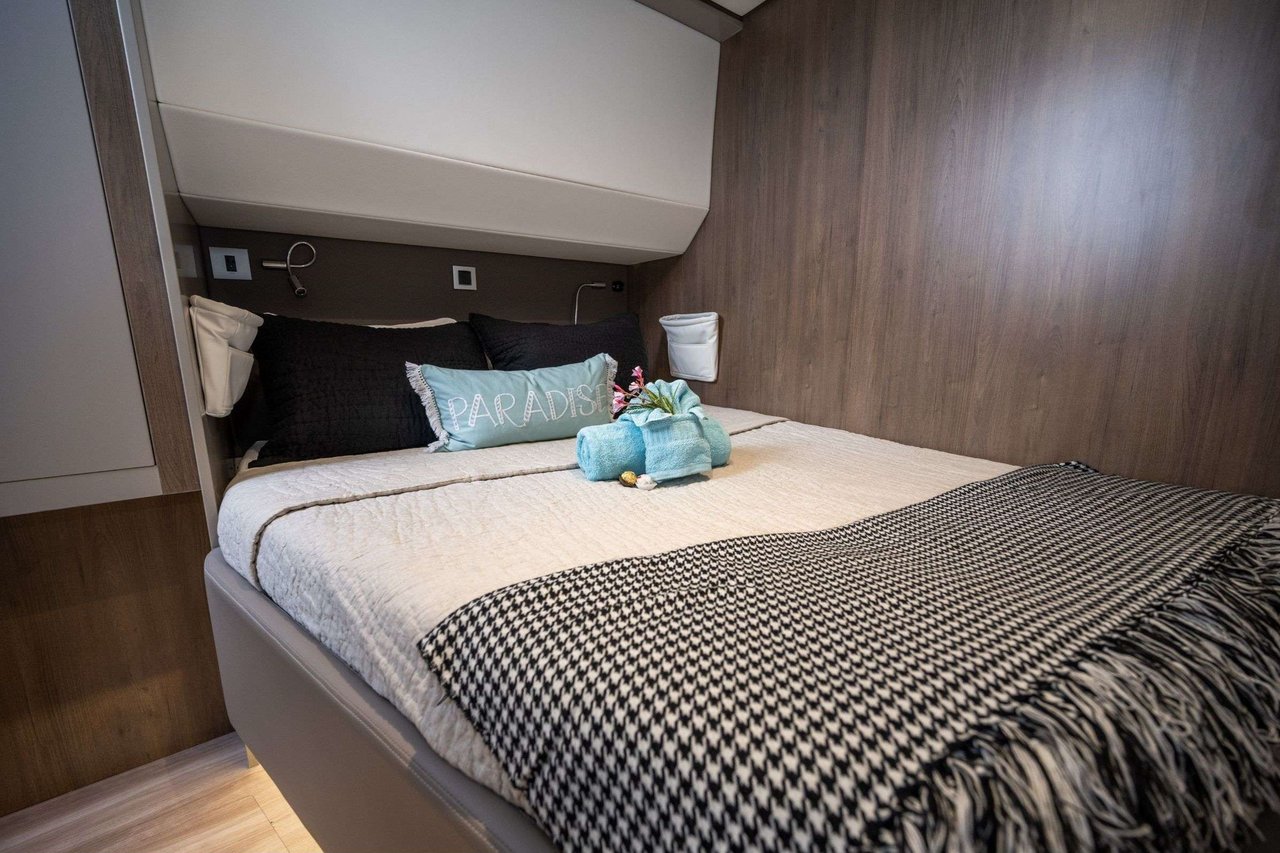 Award-winning Bali 5.4 catamaran design • Brand new 2023 launch • Teak decking throughout • Spacious master suite plus 3 queen cabins • Up to 8 guests • “Bali garage door” concept for seamless indoor–outdoor living • Expansive flybridge with sunbathing & cocktail lounge • Solid foredeck lounge • Fully equipped galley • Wine fridge, coffee/espresso machine & premium appliances • Extensive collection of water toys • Underwater scooters, wake surfboard & floating dock