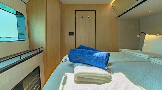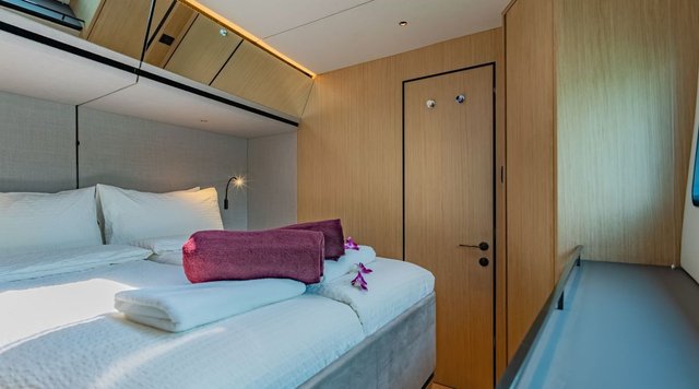 Seeking relaxation? Lounge on the cushioned sun pads positioned elegantly forward of the superstructure, soaking up the sun’s warm rays. JACK’s accommodating spirit extends to its guests, with 8 individuals luxuriously accommodated in 4 ensuite double cabins, promising a restful and rejuvenating stay on the high seas