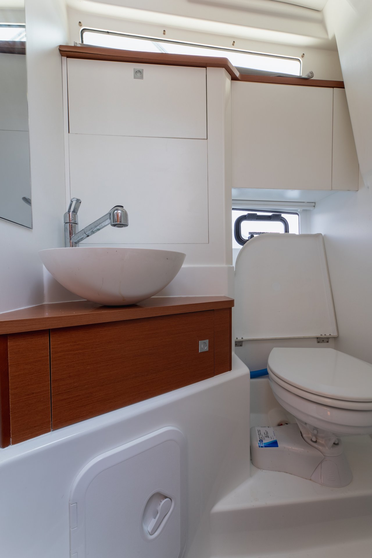 Sporty hull with excellent seakeeping • Bright and airy interior with convertible saloon • Contemporary design by Garroni Studio • Cockpit with smart layout • High-quality finishes • Master cabin with shared bathroom • Cruising speed of 20 knots • Maximum speed of 30 knots • Bathing platform for easy sea access • Bow thruster for easy maneuvering • Fridge and modern galley features • Snorkeling gear included for water fun