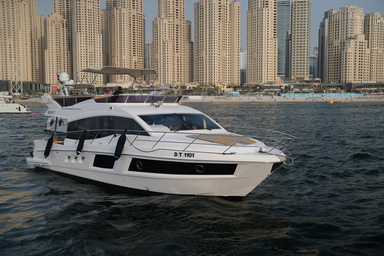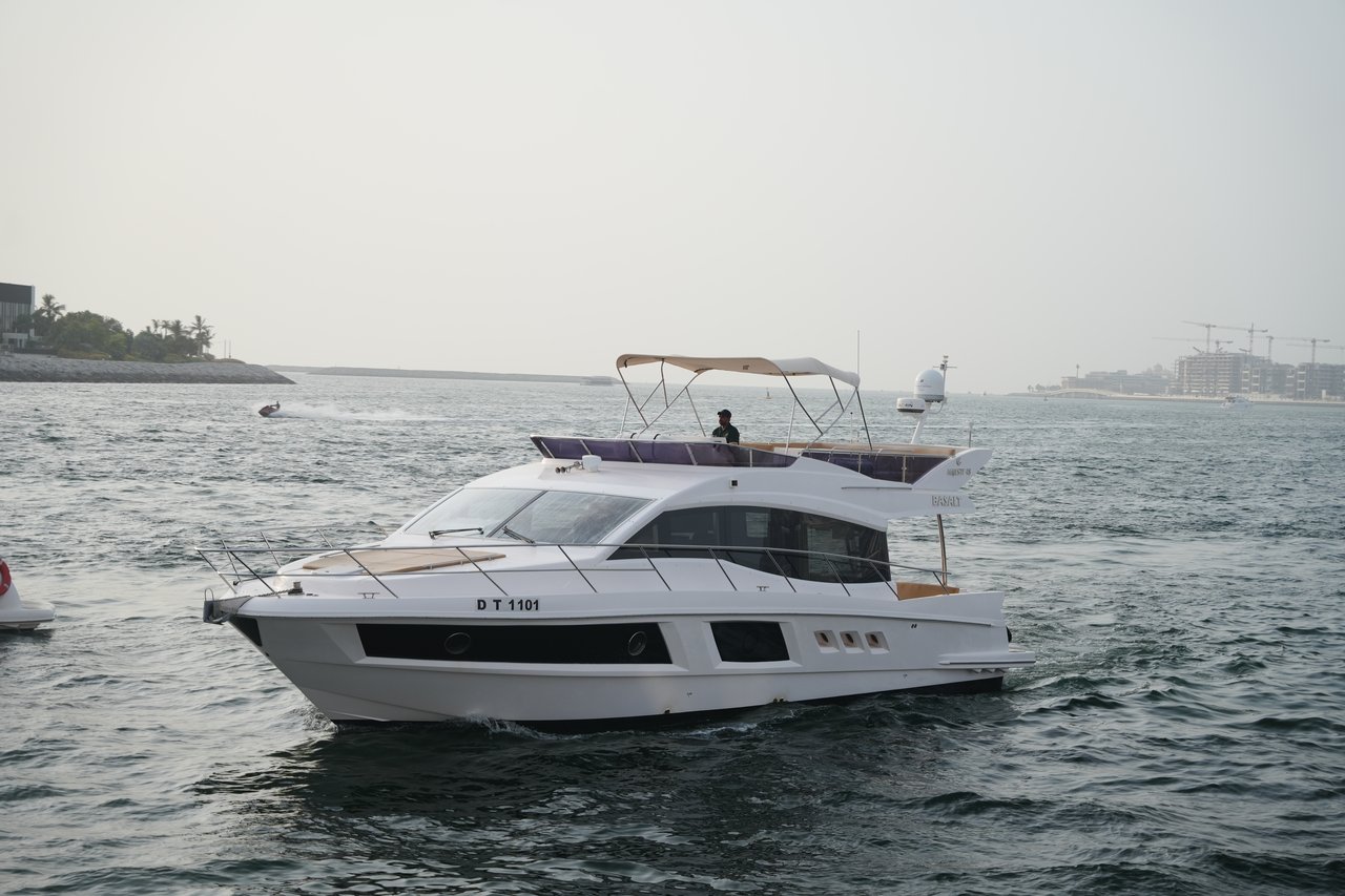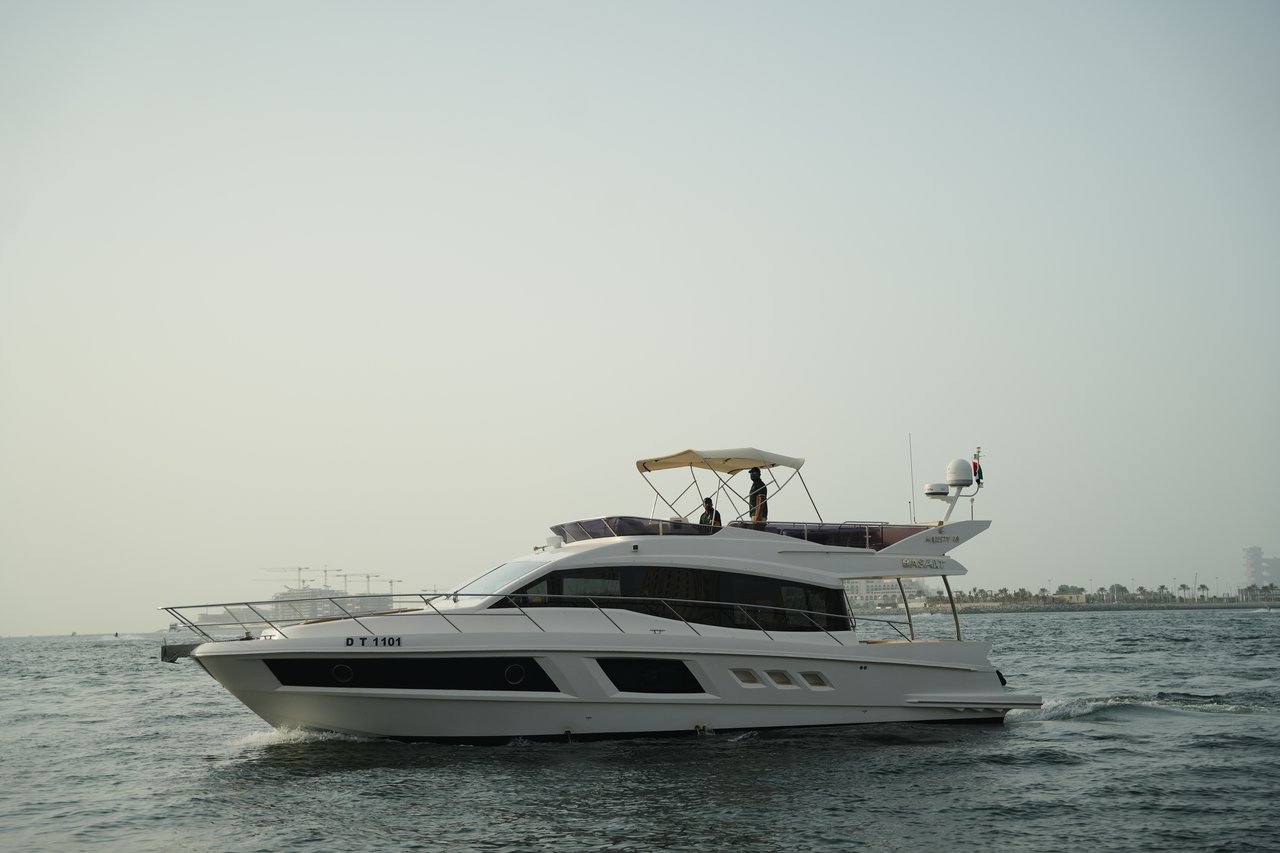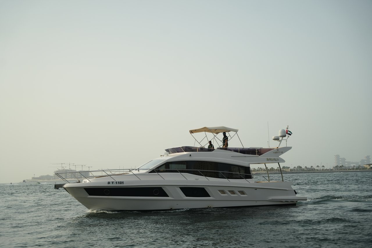 Flybridge motor yacht by Gulf Craft • Refined interiors with Italian cherry wood finishes • Accommodates up to 6 guests in 3 cabins • Expansive flybridge • Sun loungers & seating • Top speed of 30 knots • Jacuzzi-style sunbed area • Spacious saloon with upper & lower lounges • Teak deck with open cockpit seating • Sound system with flat-screen TV • Rear bathing platform with mini-shower • Professional crew ensuring smooth service