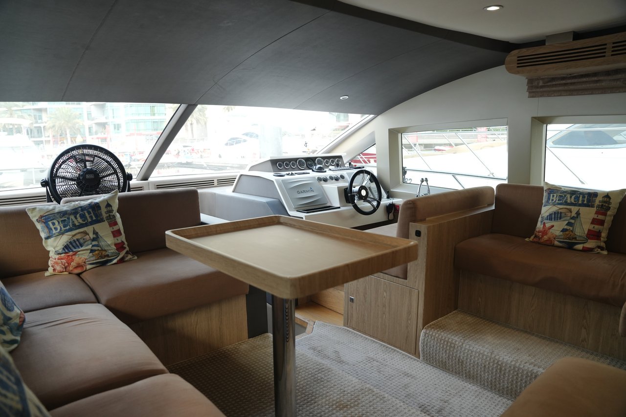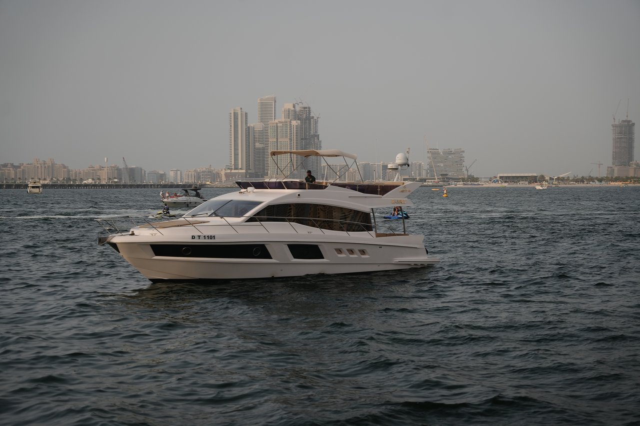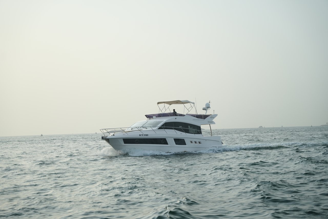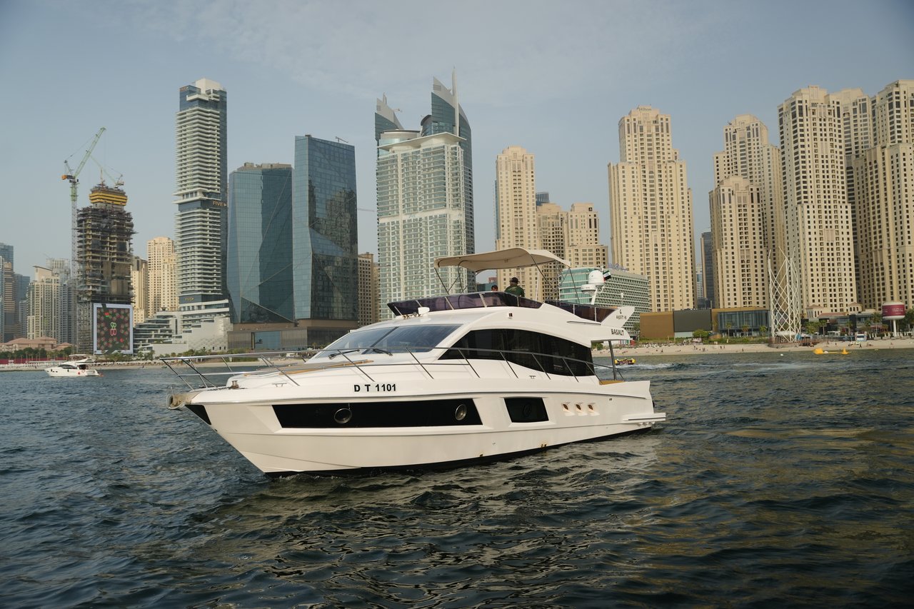Flybridge motor yacht by Gulf Craft • Refined interiors with Italian cherry wood finishes • Accommodates up to 6 guests in 3 cabins • Expansive flybridge • Sun loungers & seating • Top speed of 30 knots • Jacuzzi-style sunbed area • Spacious saloon with upper & lower lounges • Teak deck with open cockpit seating • Sound system with flat-screen TV • Rear bathing platform with mini-shower • Professional crew ensuring smooth service