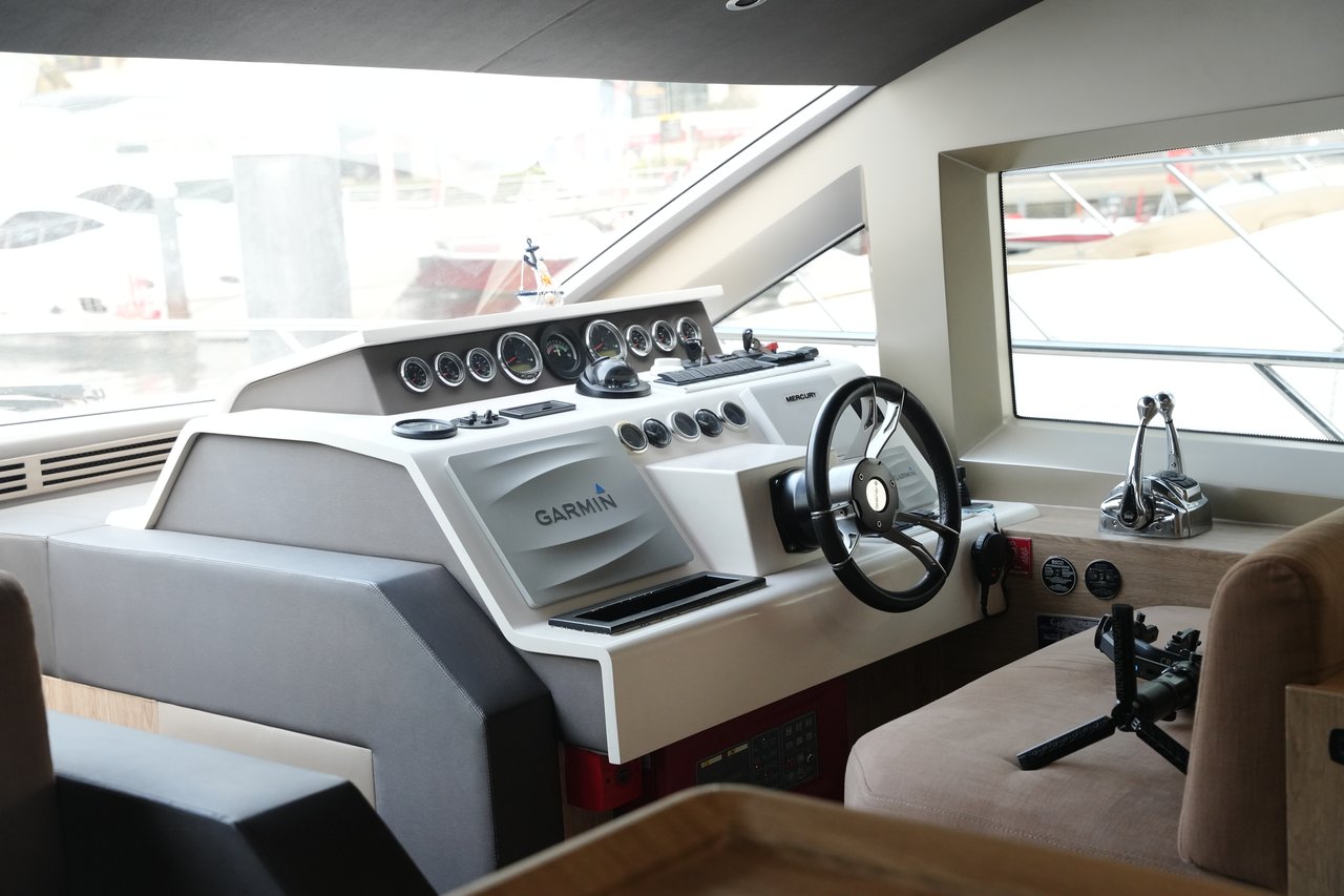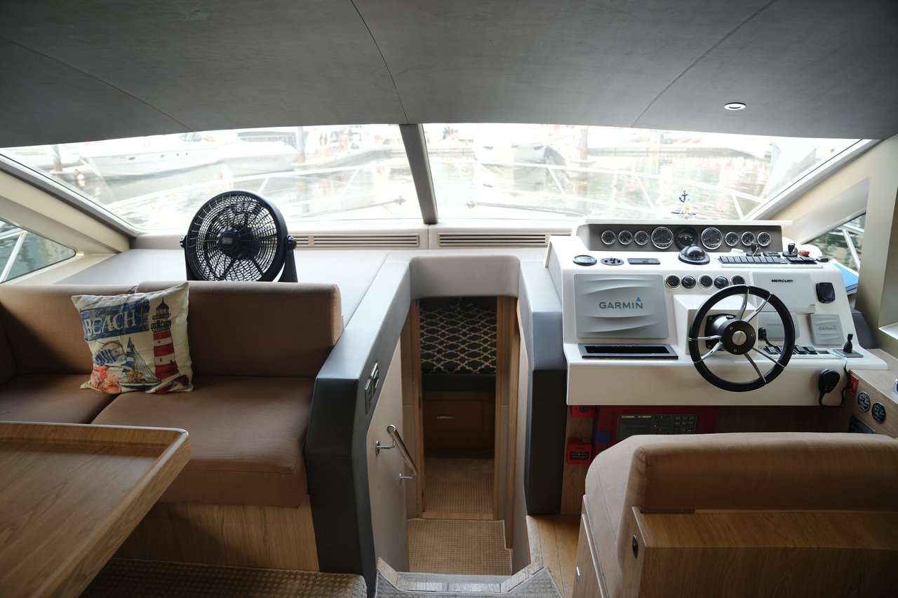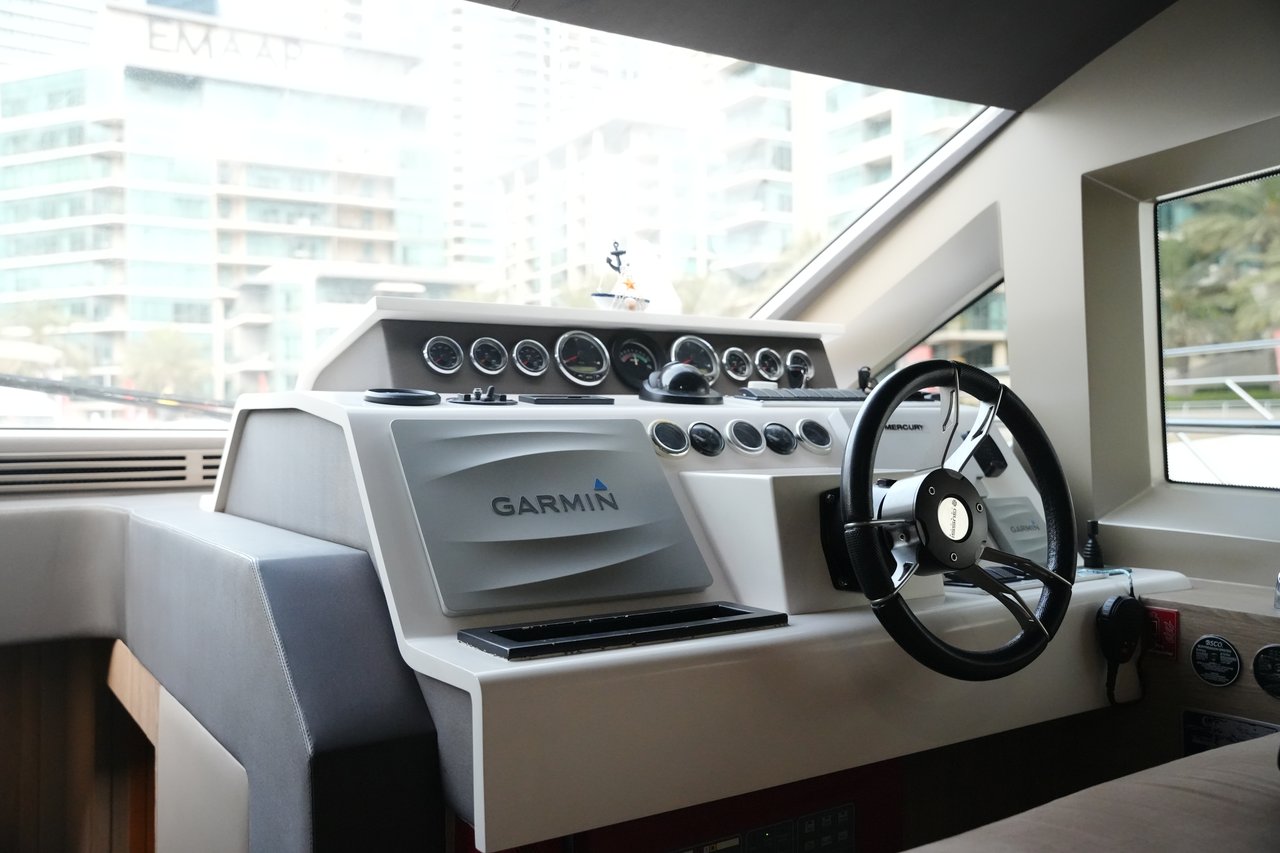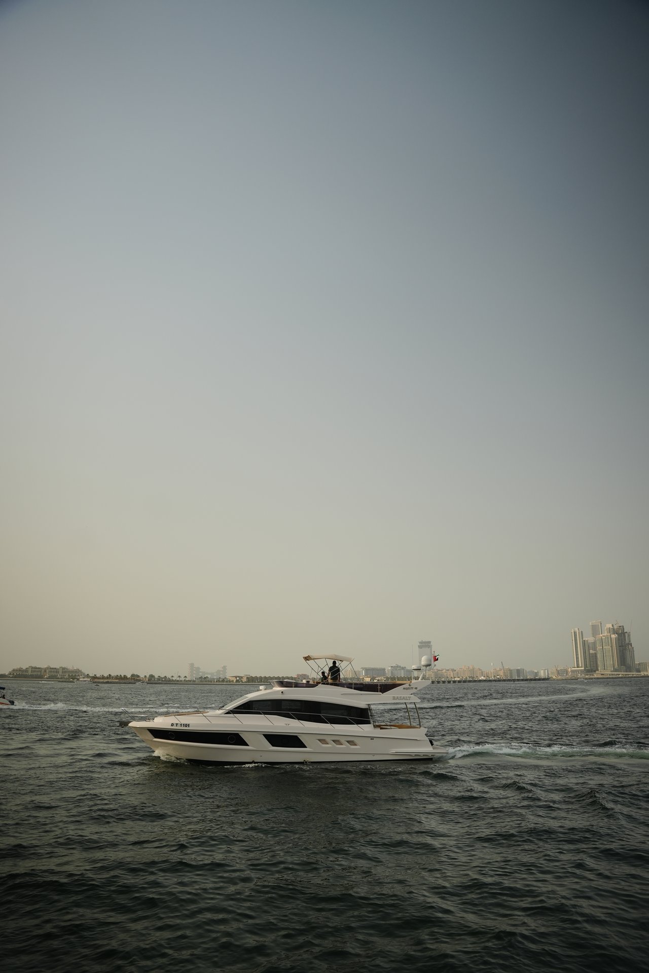 Flybridge motor yacht by Gulf Craft • Refined interiors with Italian cherry wood finishes • Accommodates up to 6 guests in 3 cabins • Expansive flybridge • Sun loungers & seating • Top speed of 30 knots • Jacuzzi-style sunbed area • Spacious saloon with upper & lower lounges • Teak deck with open cockpit seating • Sound system with flat-screen TV • Rear bathing platform with mini-shower • Professional crew ensuring smooth service
