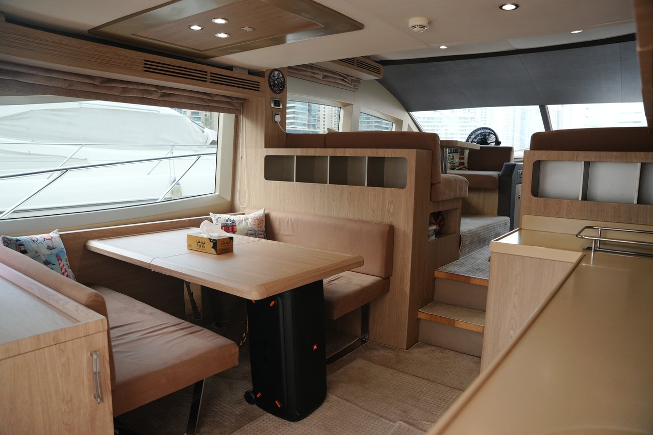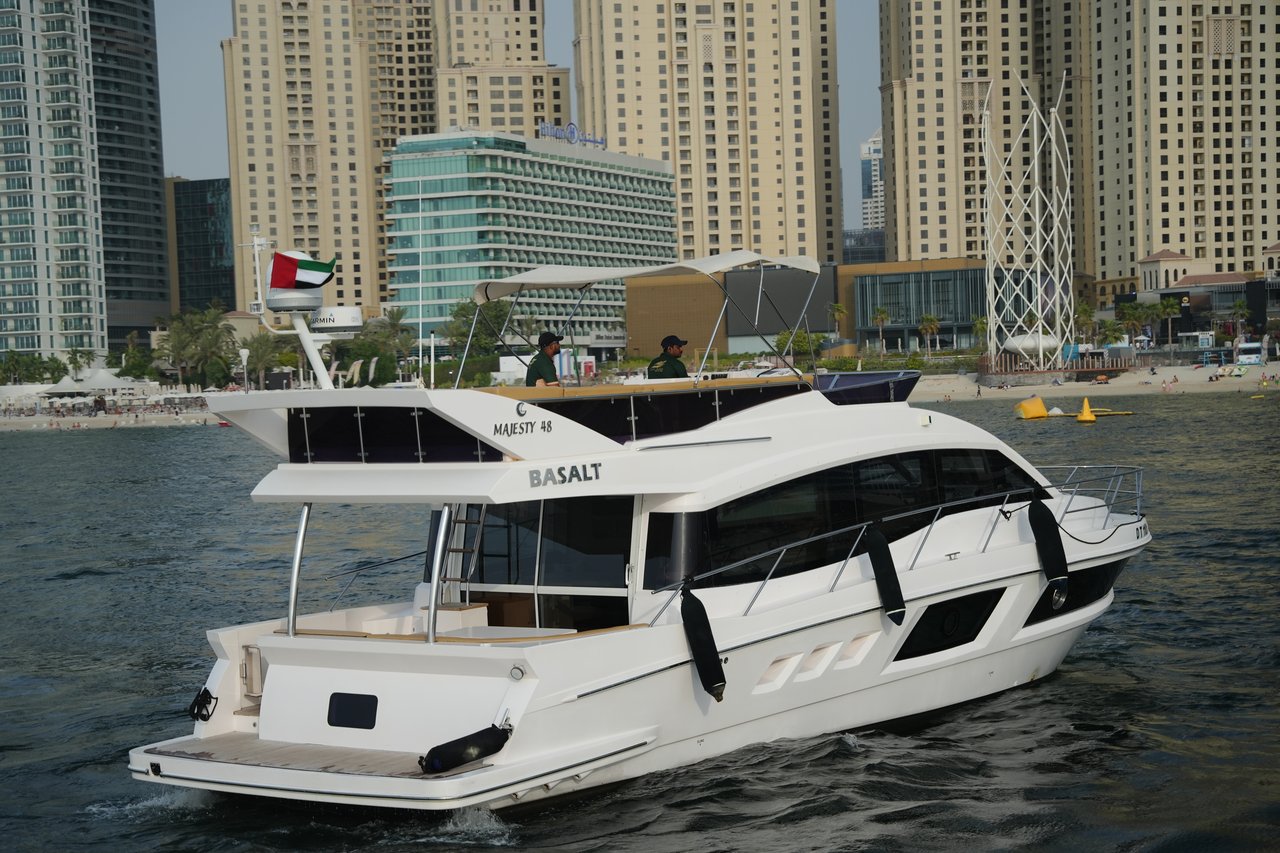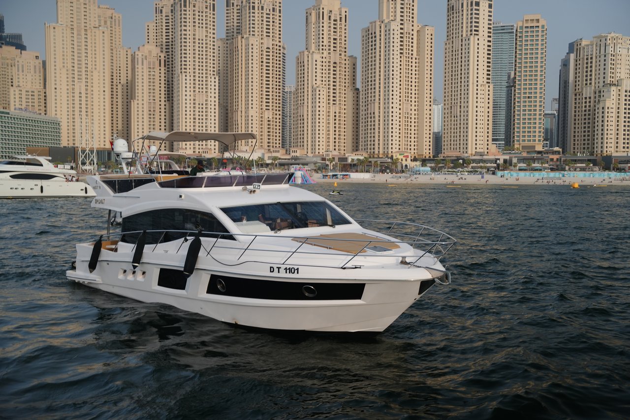 LUNA ROSA – GOLD is the epitome of Dubai yachting luxury. Built by Gulf Craft, this 48ft Majesty model combines sleek exterior styling with spacious interiors, offering the perfect setting for day charters, family getaways, or intimate celebrations.