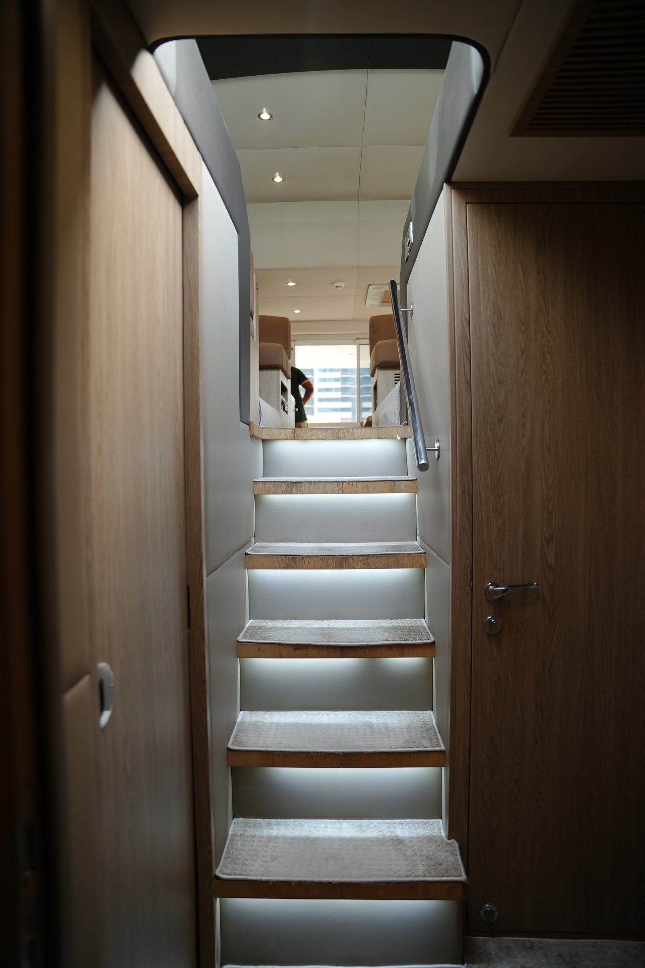 Step inside LUNA ROSA – GOLD to discover a refined saloon with cream carpeting, high-gloss cherry wood interiors, and panoramic windows. The upper saloon offers a dining table and curved seating, while the lower saloon creates a cozy lounge for social moments.