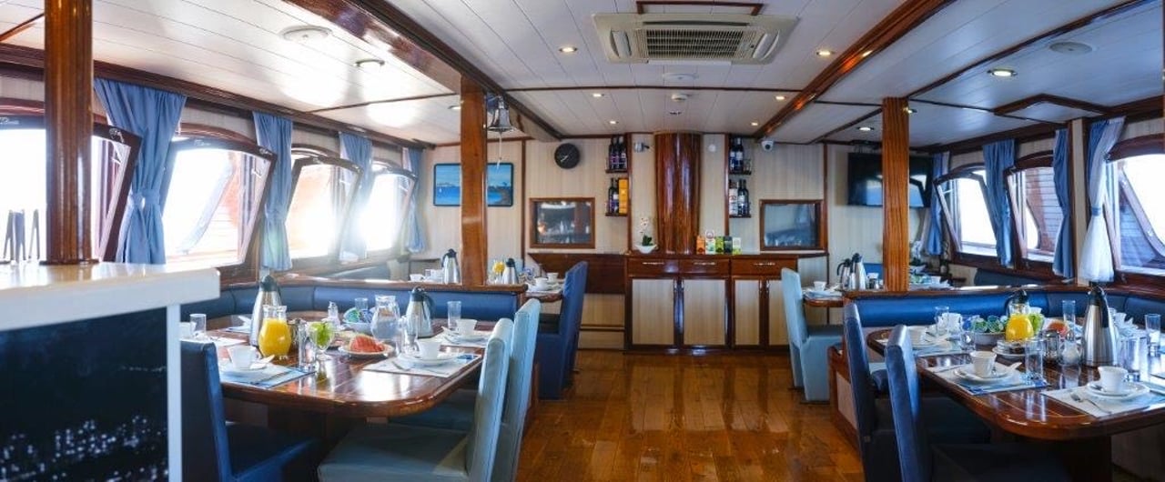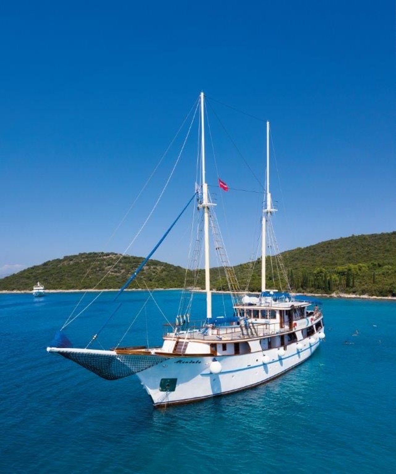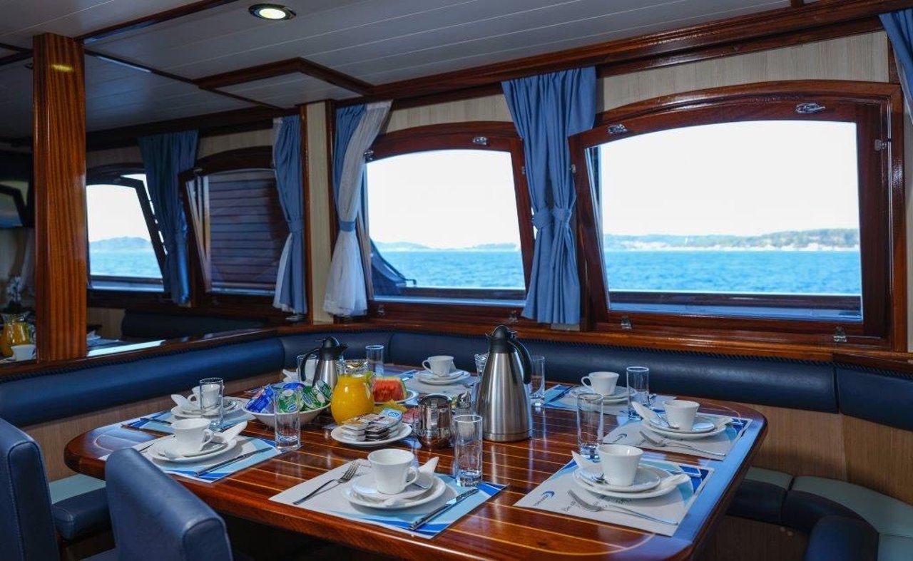 Twin-masted mini cruiser • 13 ensuite cabins for 26 guests • Refit in 2018 with upgraded interiors • Expansive sundeck with loungers • Jacuzzi on deck • Swim platform with easy water access • Onboard bar & alfresco lounge • Air-conditioned interiors • Indoor dining salon • Complimentary Wi-Fi • Wide selection of water toys • Professional crew of 7