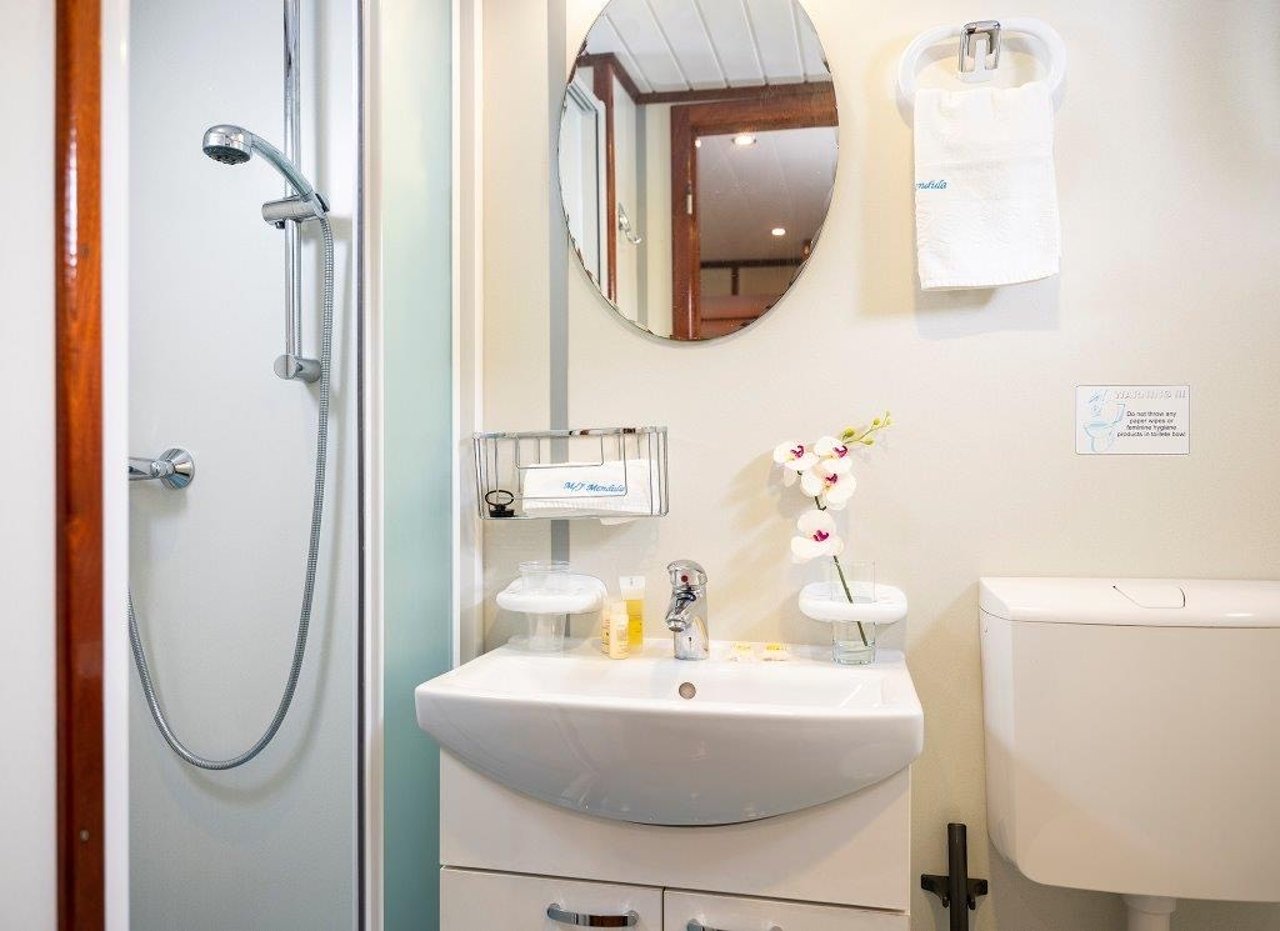 MENDULA offers spacious accommodation for up to 26 guests in 13 double cabins, each thoughtfully designed for comfort and functionality. All cabins are individually air-conditioned and equipped with private ensuite bathrooms, ensuring every guest enjoys privacy and convenience.