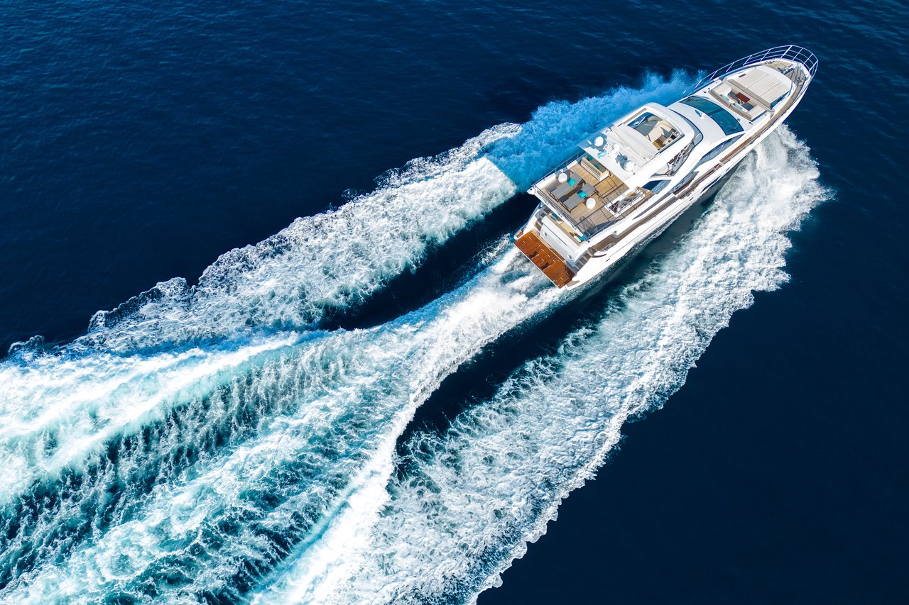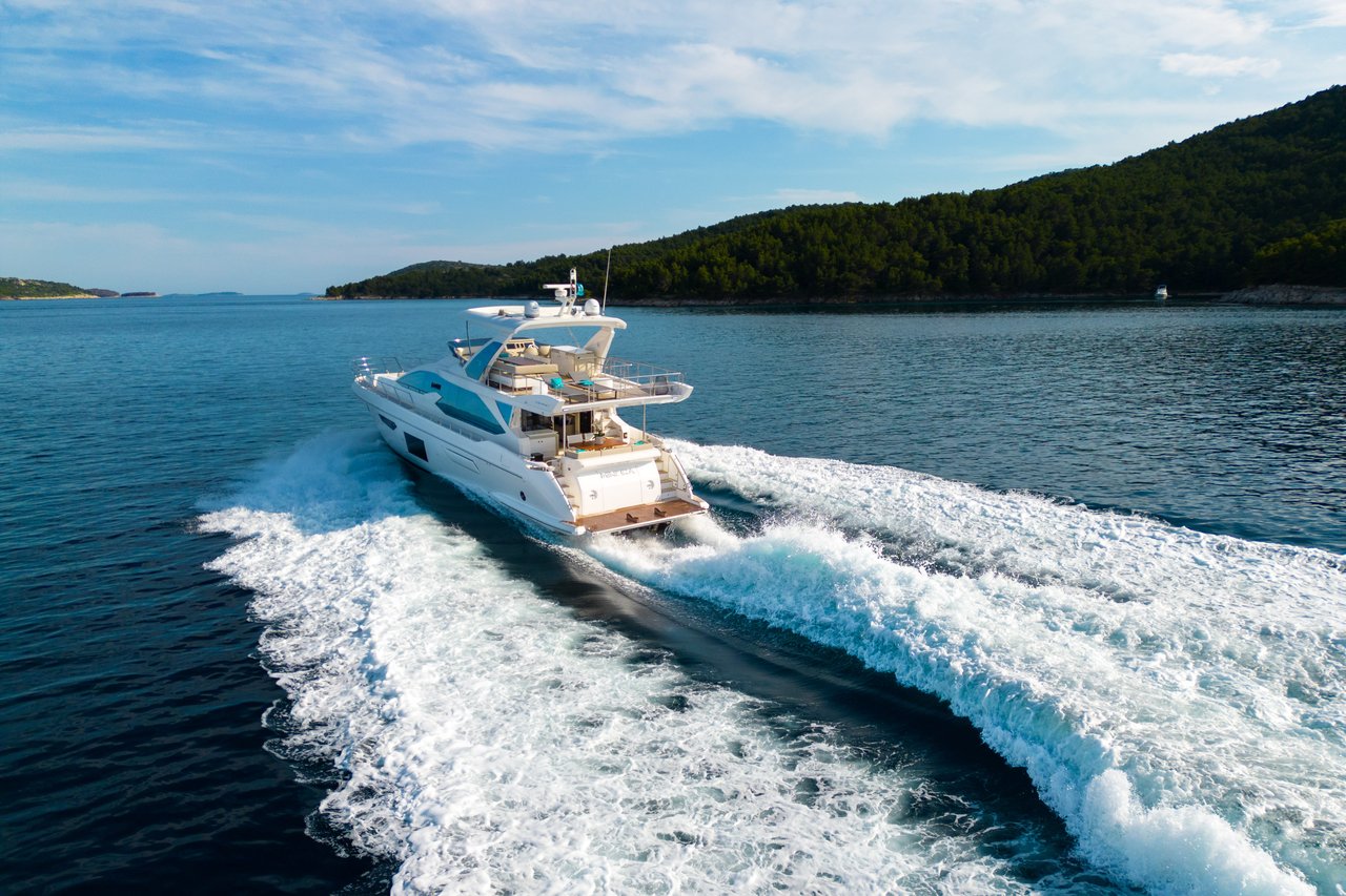 Built in 2018 by Azimut • Accommodates 8 guests in 4 ensuite cabins • Largest flybridge in her class • Cruising speed of 26 knots • Top speed 32 knots • Stabilizers at anchor and underway • Expansive cockpit seating for 8 guests • Fully equipped galley with dishwasher, ice maker & oven • BBQ and bar for alfresco dining • Entertainment system • Flat-screen TV & audio • Bathing platform and sun pads • Operated by professional crew of 2