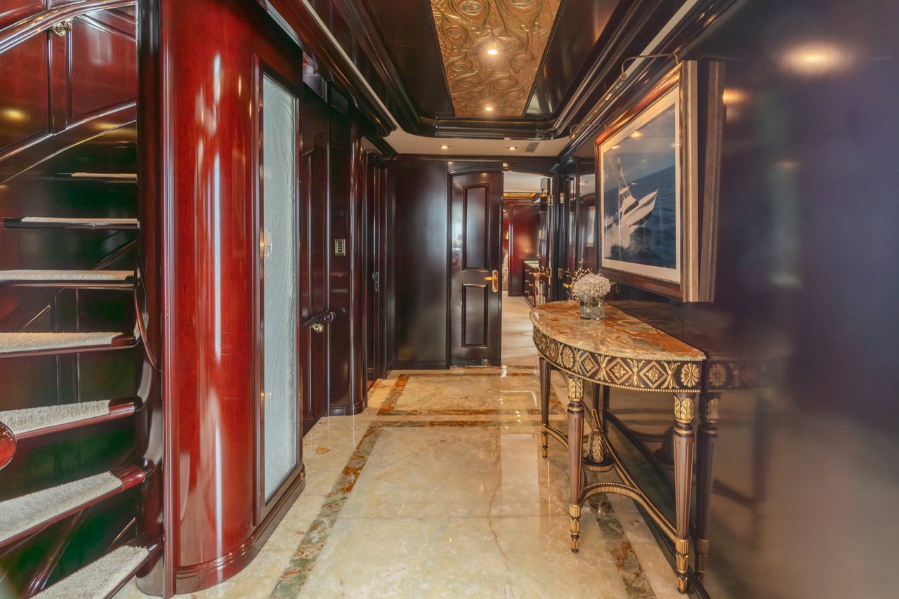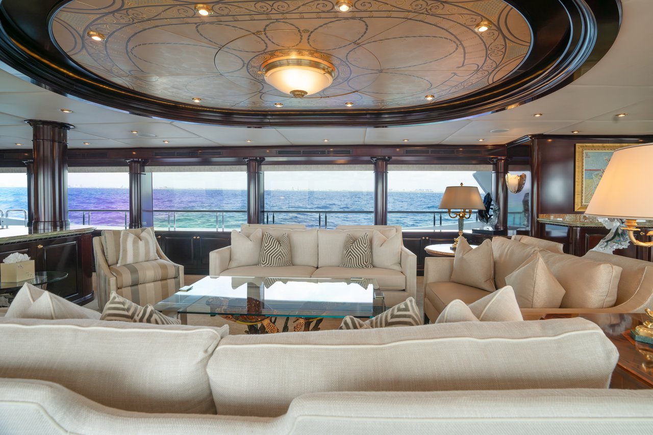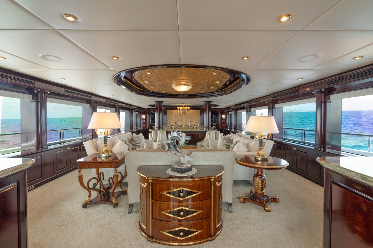 Built with an aluminum hull and superstructure, MISS CHRISTINE benefits from a semi-displacement design that delivers impressive speed and stability. Powered by twin Caterpillar engines, she cruises comfortably at 14 knots, reaches up to 19 knots, and offers a range of 3,500 nautical miles at 18 knots from her 62,460-litre fuel capacity.