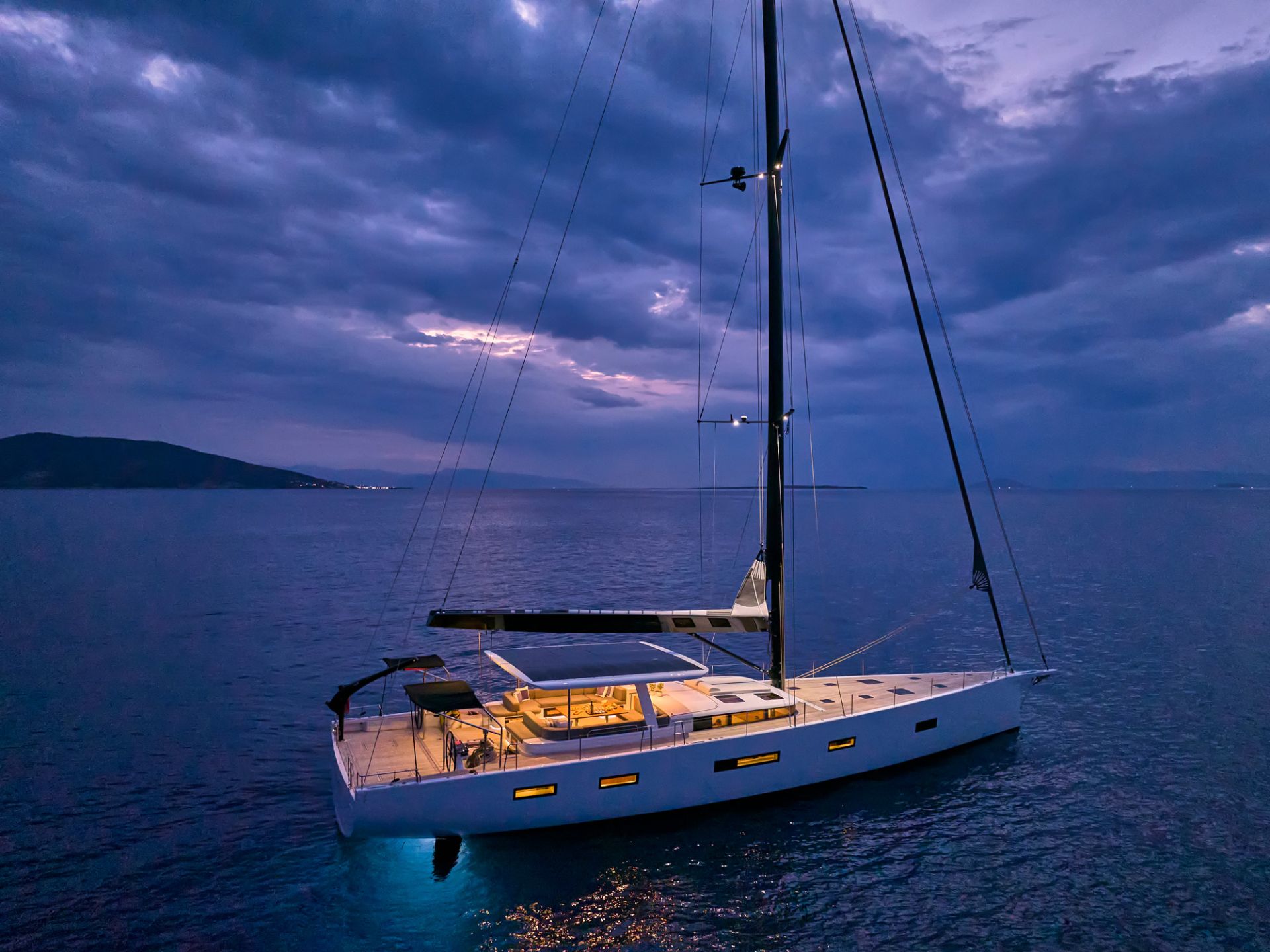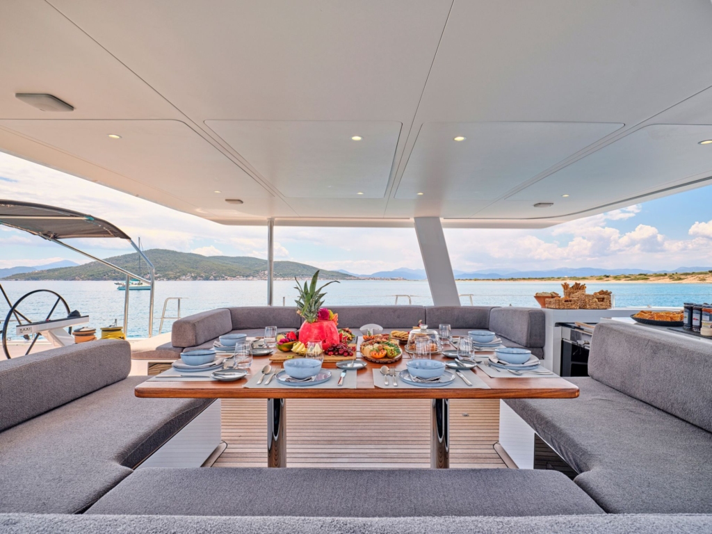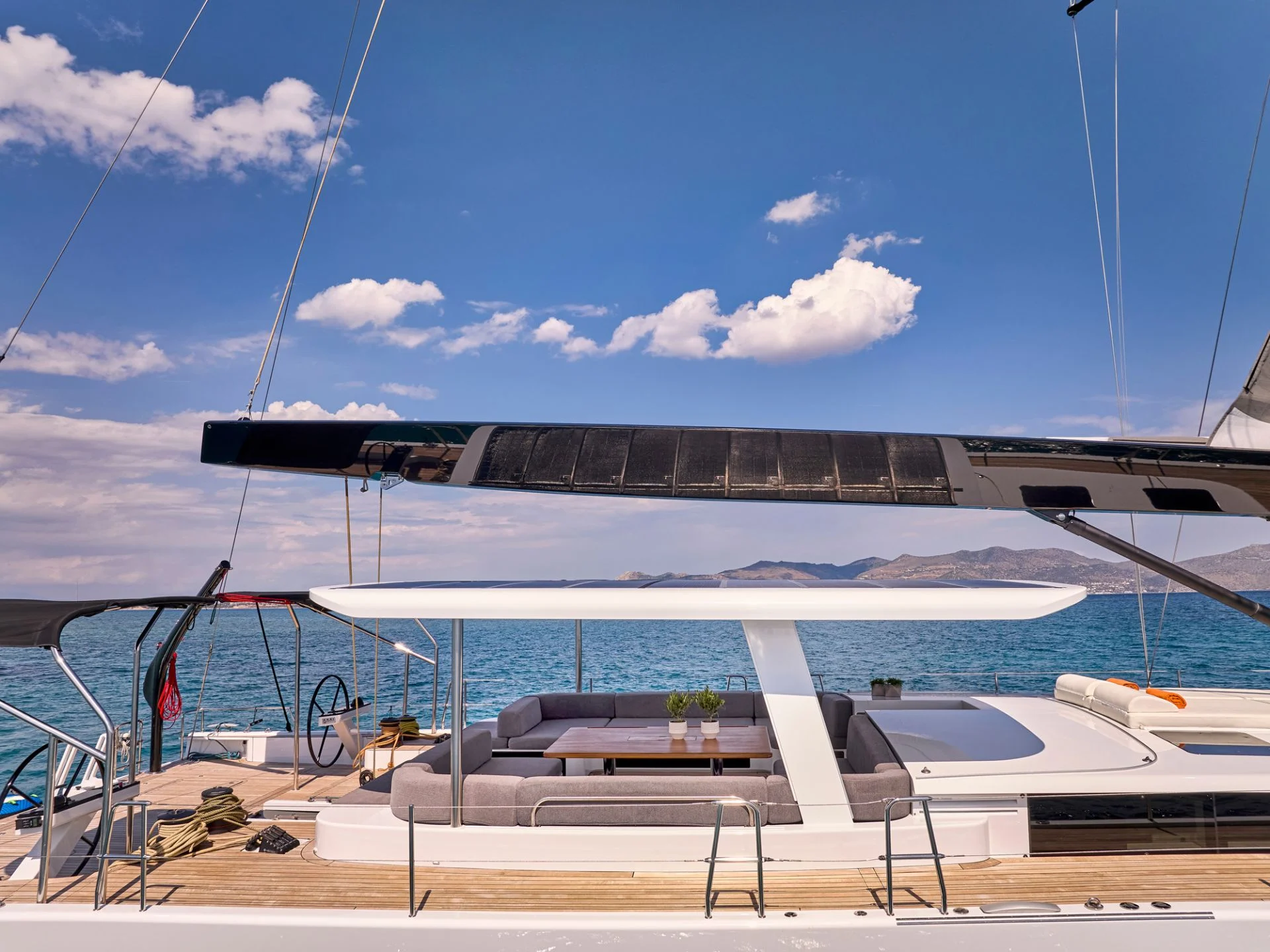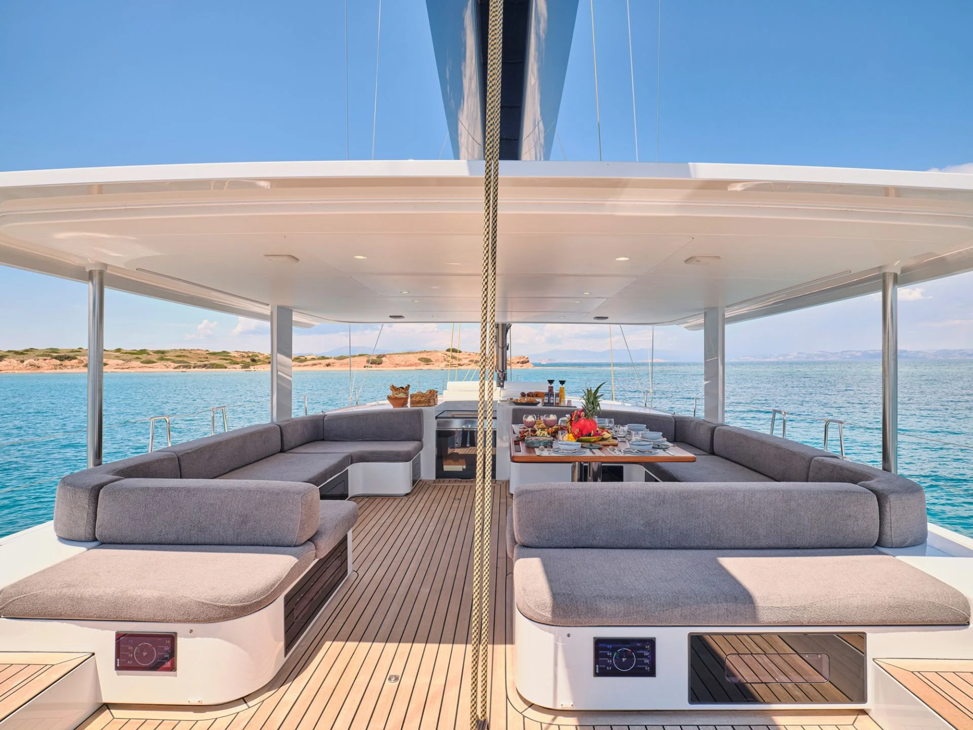 On deck, her spacious cockpit and sunbathing areas invite you to fully embrace Mediterranean outdoor living. Enjoy alfresco dining beneath the shade of the bimini, lounge on deck cushions under the sun, or take in the sea breeze as her sails carry you toward your next destination.