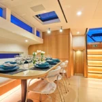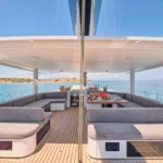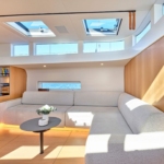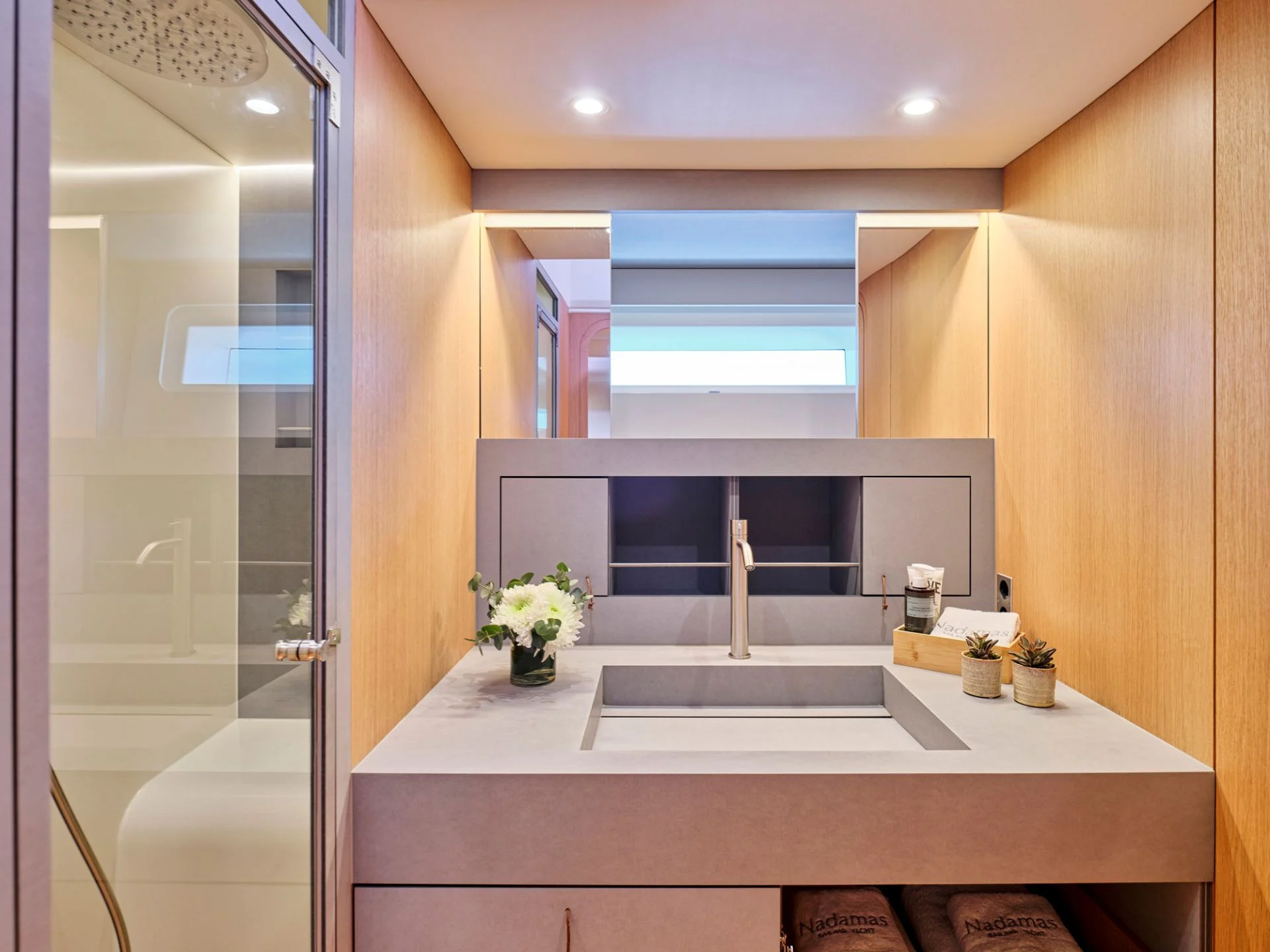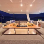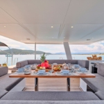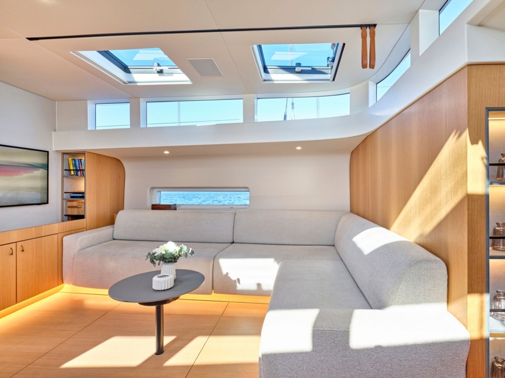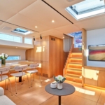 Inside, NADAMAS’ interiors reflect a modern sailing ethos—bright, open, and airy. The main salon offers panoramic views, plush seating, and a relaxed, social atmosphere, ideal for morning coffees, casual meals, or evening conversations.