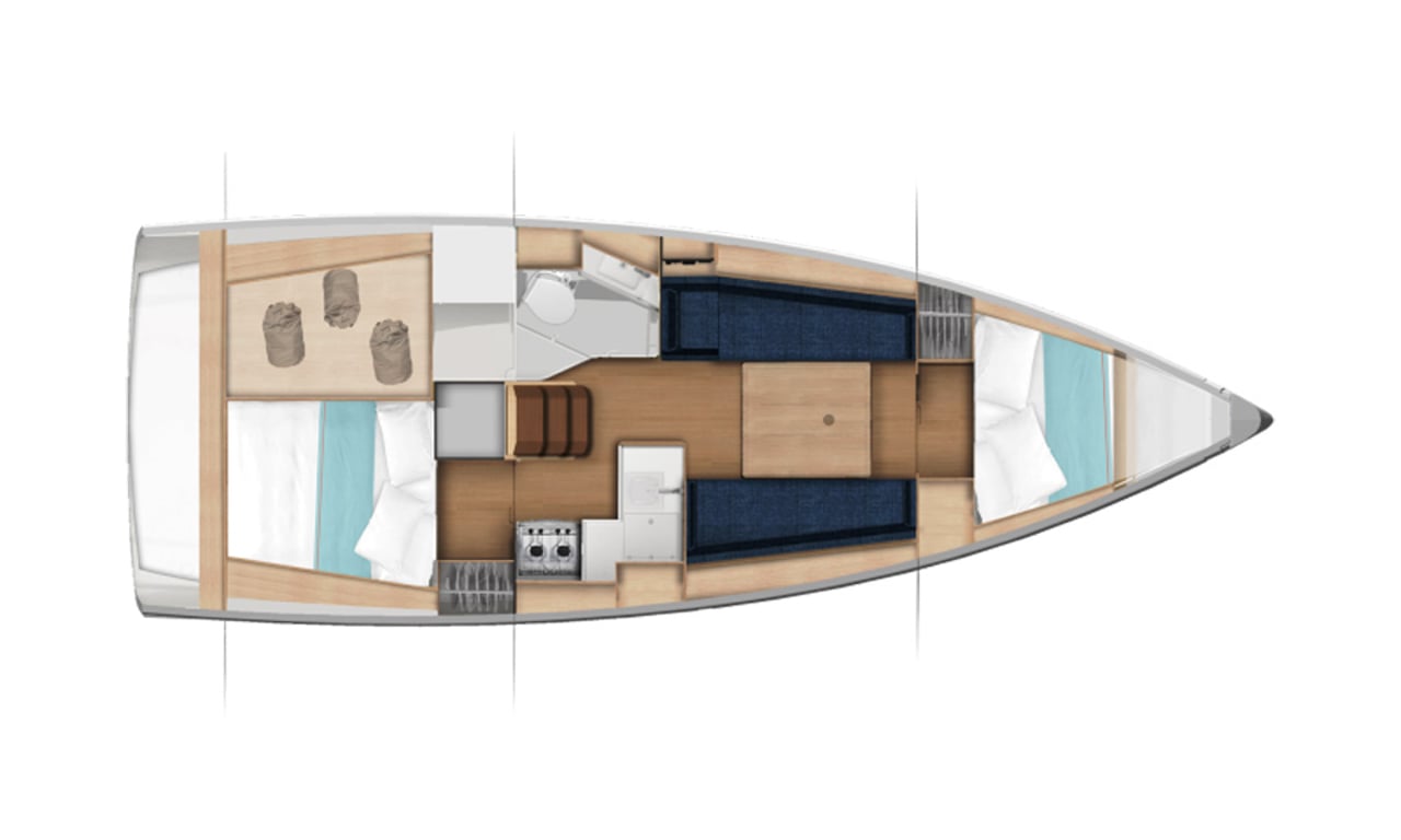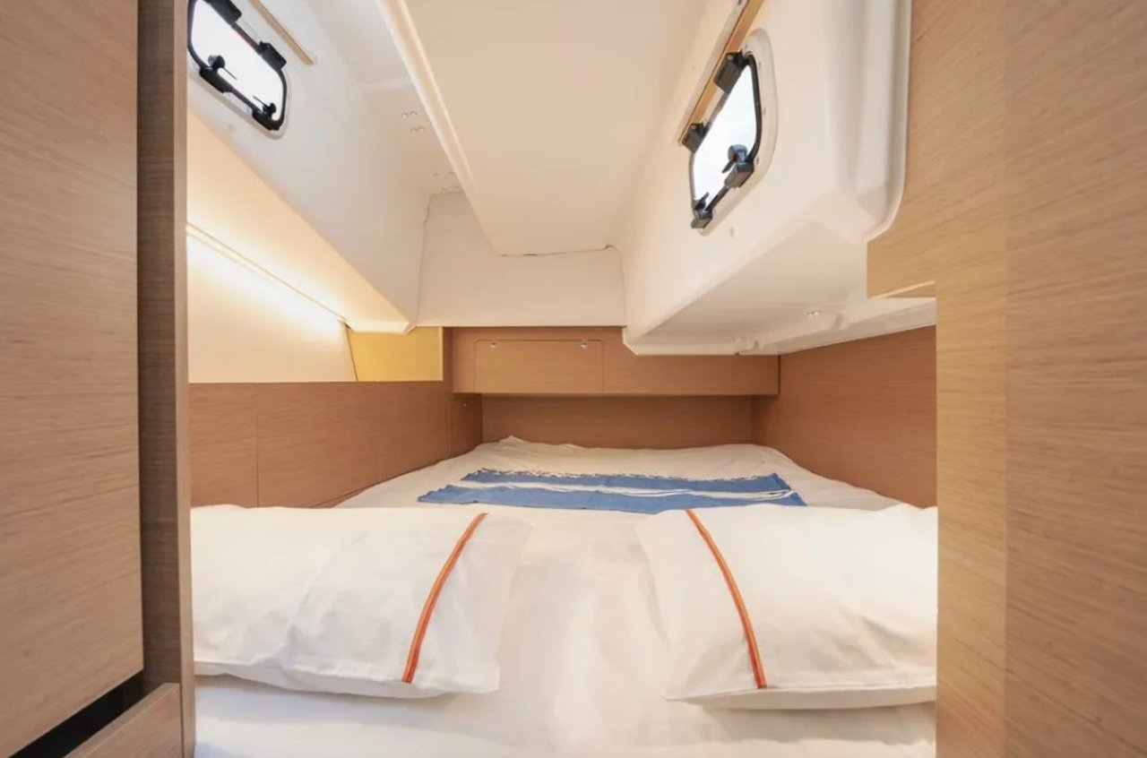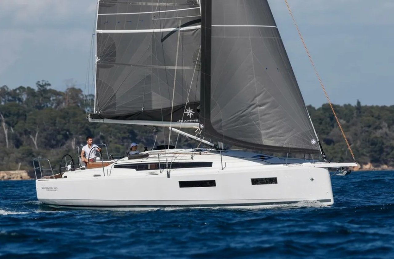 Brand-new 2025 model • Successor to the award-winning Sun Odyssey 349 • Designed by Marc Lombard • Walkaround side decks • Twin off-centered helms • Spacious saloon • Large aft head with separate shower • Forward and aft double cabins • Bright interior • Yanmar 29hp engine • Fold-down swim platform • 2-burner stove, fridge & freezer • Wood inlay & twin wheels • Full-batten mainsail & self-tacking jib • High coamings for added safety at sea