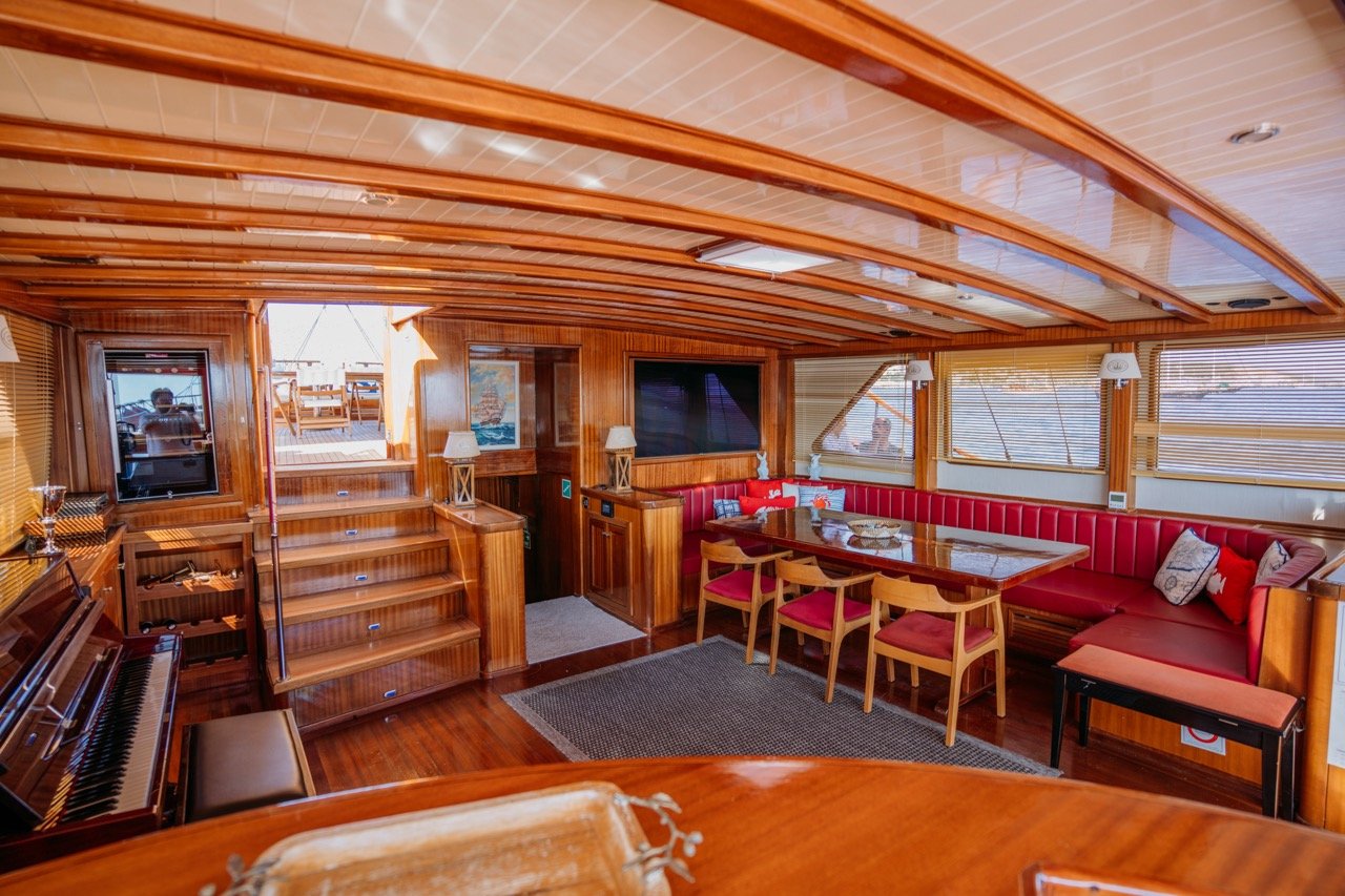 Expansive teak decks make QUEEN OF DATCA a haven for sunbathing, socializing, and alfresco dining. Shaded lounging areas invite you to relax during the day, while the open deck becomes the perfect setting for evening dinners under the stars. The warm wood interiors and elegant salon provide a refined indoor retreat.