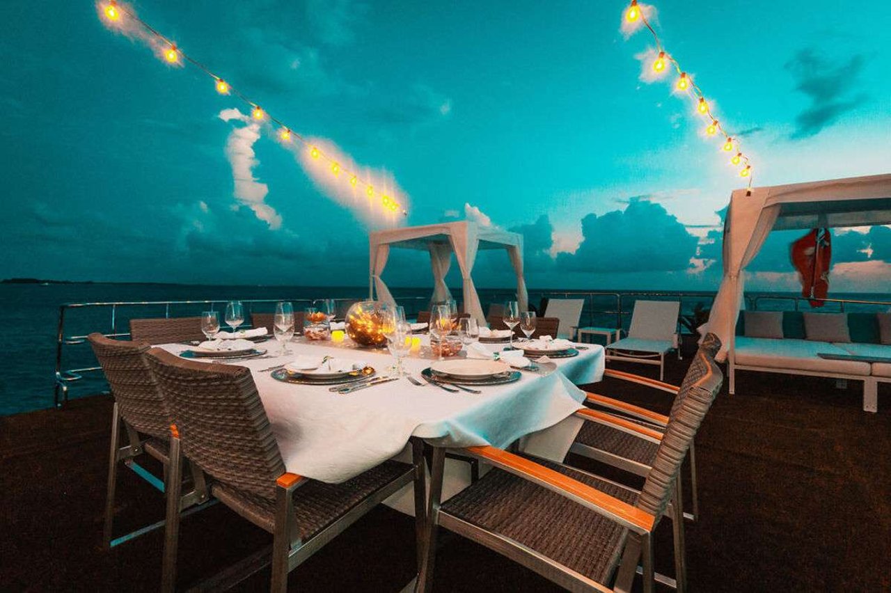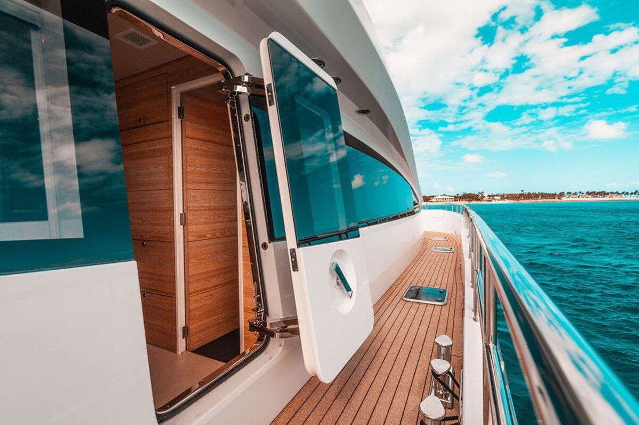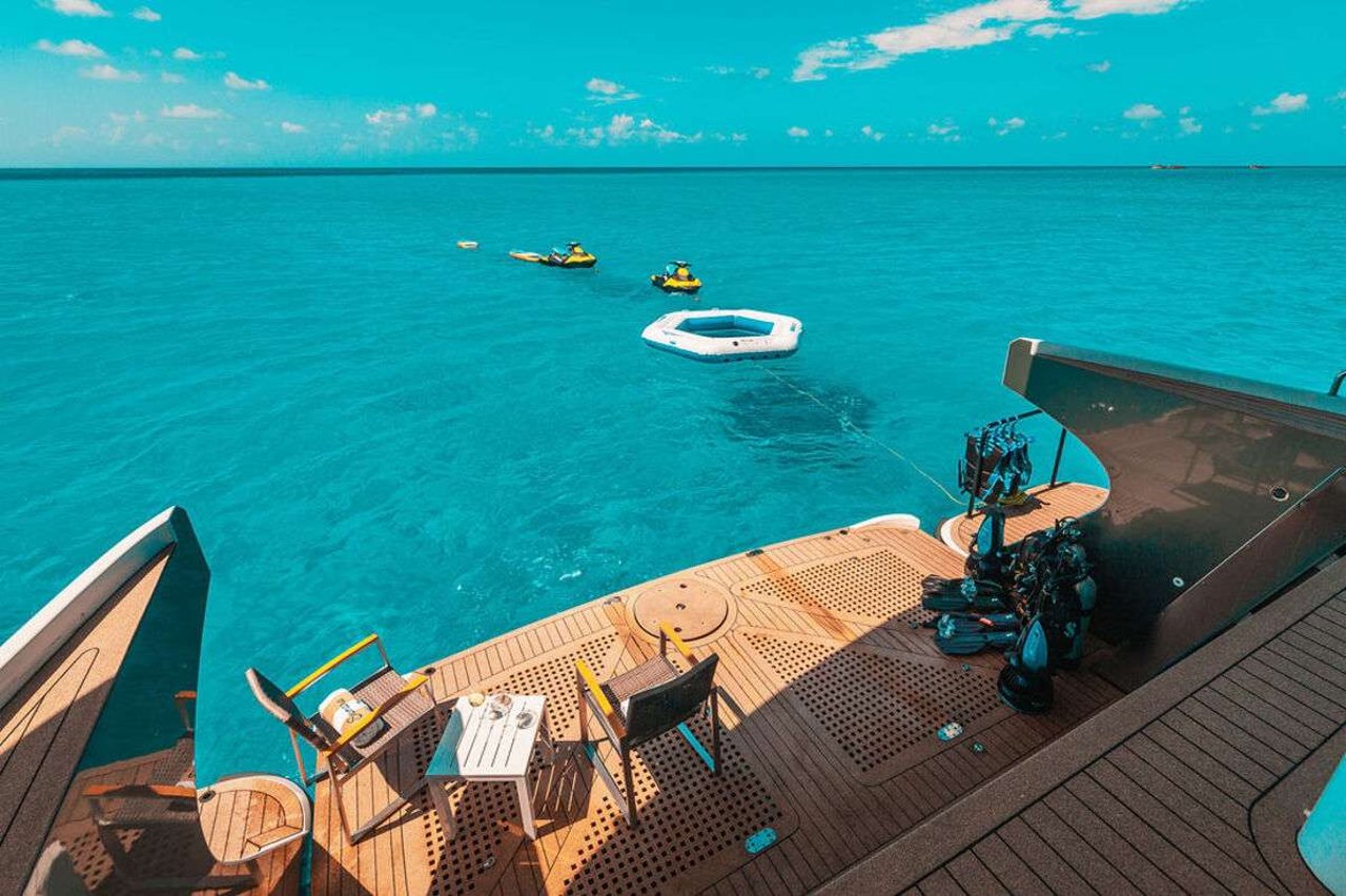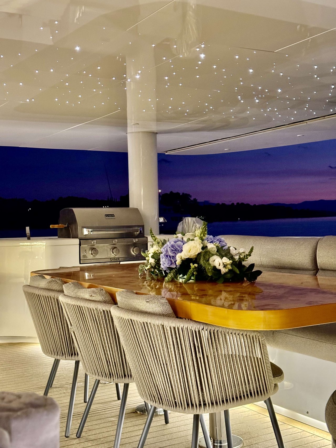 The yacht’s expansive decks invite relaxation and socializing, from the aft al fresco dining area with full barbecue to the sun deck with cabanas, sunpads, and a ‘jump seat’ for panoramic views. Moreover, the swim platform doubles as a beach club for water activities or serene lounging. Whether enjoying cocktails, starry-night dinners, or cinematic evenings, every deck space on SAMARA is designed to enhance your charter experience.