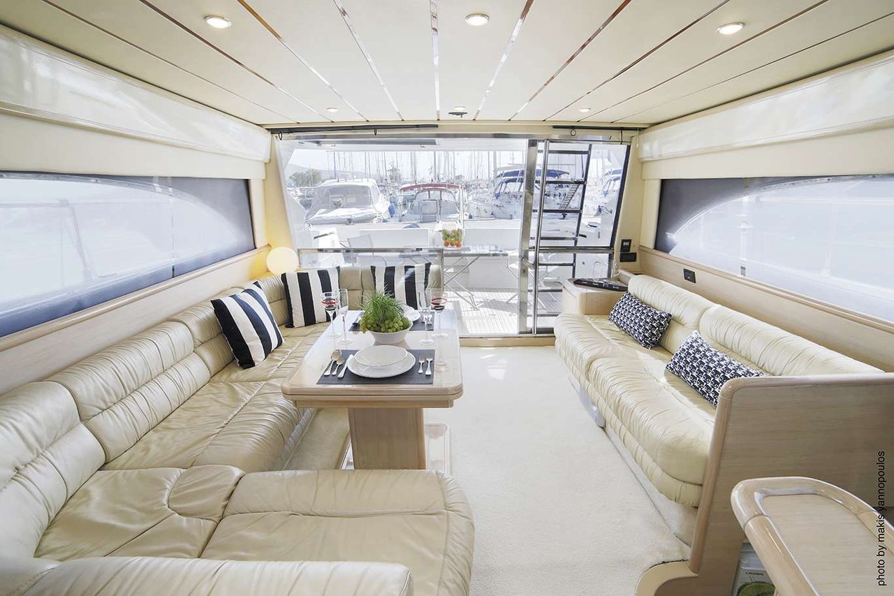 Built by Ferretti Yachts • Timeless 53-foot motor yacht • 3 guest cabins • Sleeps 6 guests in comfort • Professional crew of 3 • Cruising speed of 22 knots • Max speed of 30 knots • Expansive aft deck with dining & lounging • Sun pads for relaxation • Full teak deck for premium style • Bathing platform with ladder • Jetski, Seabob & water sports equipment • Generator & water maker • Air conditioning throughout