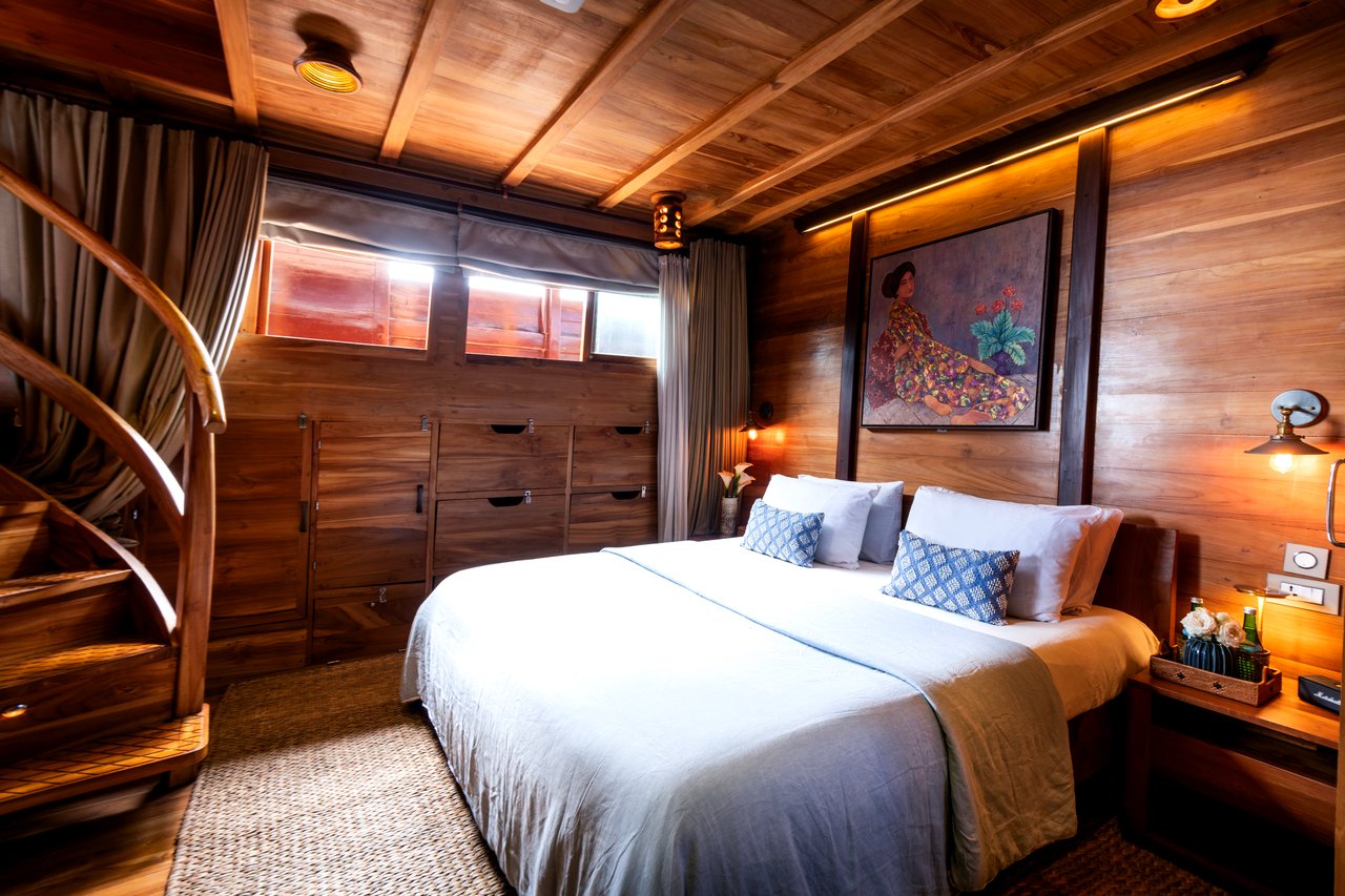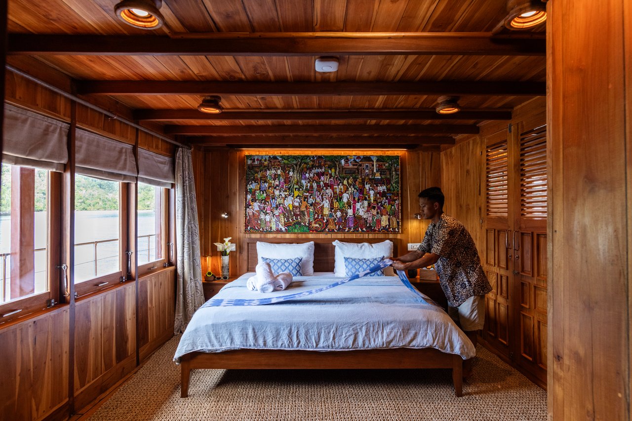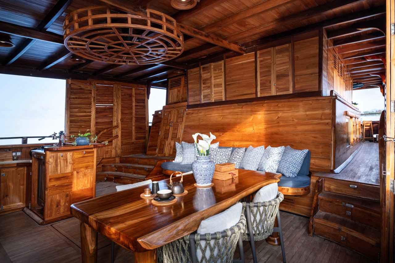 Hand-crafted wooden schooner • Built for Indonesian exploration • Eco-conscious design • Low fuel consumption & no single-use plastics • Silent sailing enabled by advanced materials • Accommodates 6 guests • 3 luxurious cabins • Professional crew of 12 for exceptional service • Unique itineraries • Enjoy 18,000-island archipelago • Cinema, Karaoke • Water maker & Generator