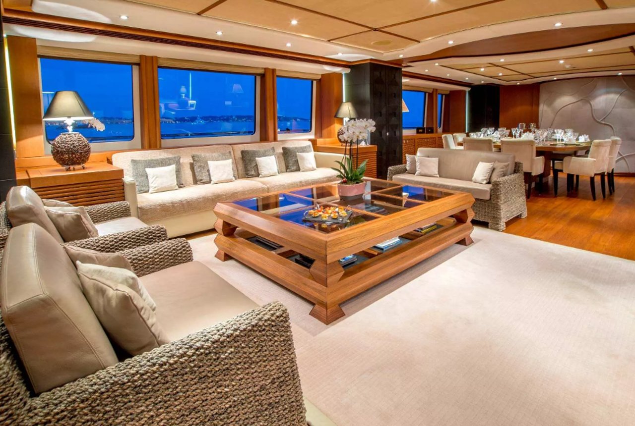 SIROCCO’s interiors are designed by Omega Architects, blending contemporary comfort with natural materials. Her main salon offers a spacious lounge with entertainment systems, while the formal dining area welcomes 12 guests in style. Large windows create an airy, light-filled atmosphere throughout.