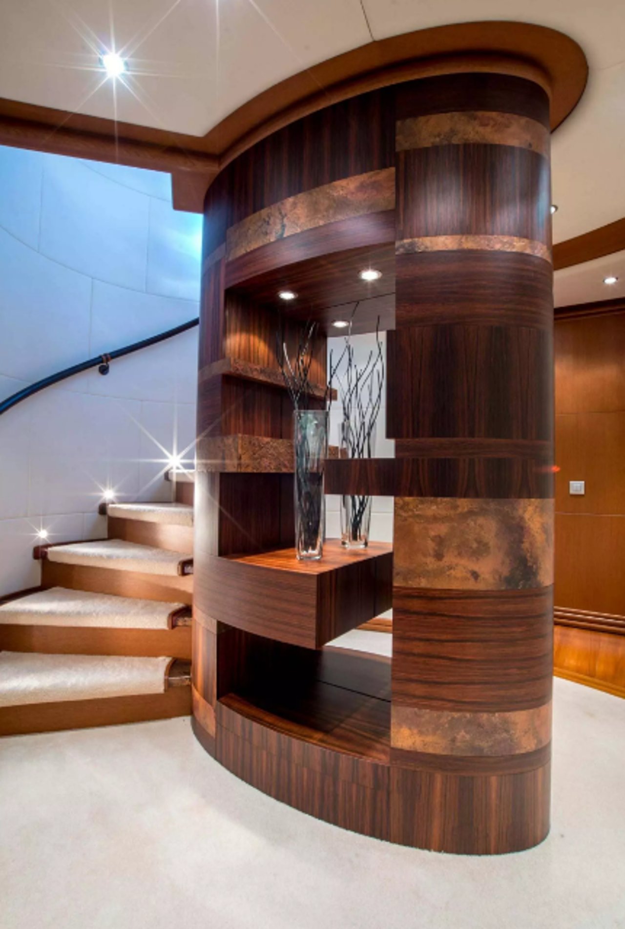 African-inspired interior with natural leather, marble & stone • Designed by Omega Architects • Full-beam upper deck master suite • VIP stateroom, 3 doubles & 1 twin • Sleeps 12 guests across 6 cabins • Professional crew of 9 • 8-person sundeck Jacuzzi • Gym & exercise equipment • Movie theatre & multimedia room • Stabilizers underway & at anchor • Sunbathing areas and expansive deck lounges • Swim platform for direct sea access • Wide range of water toys
