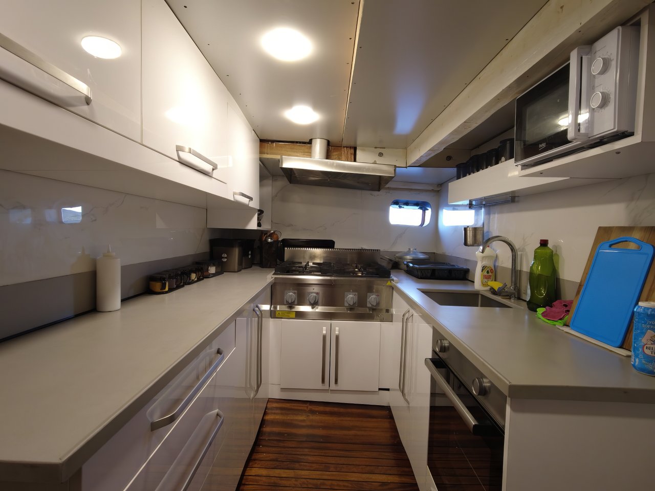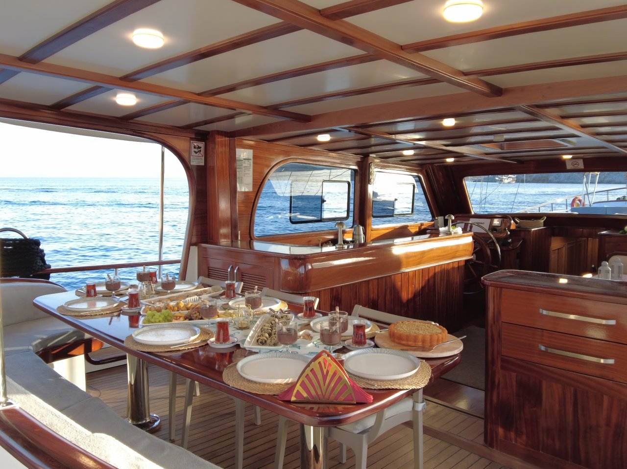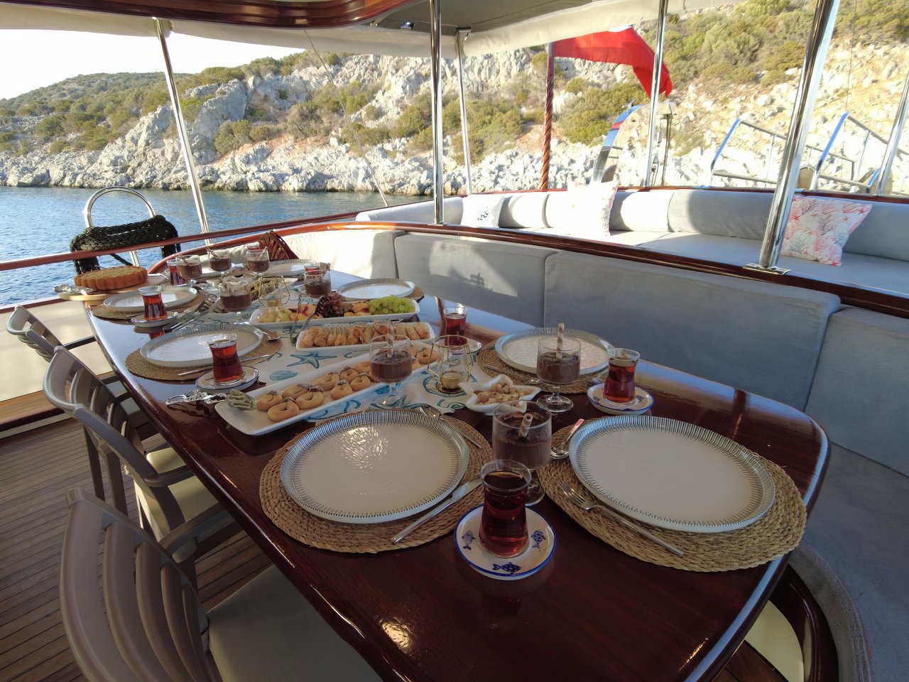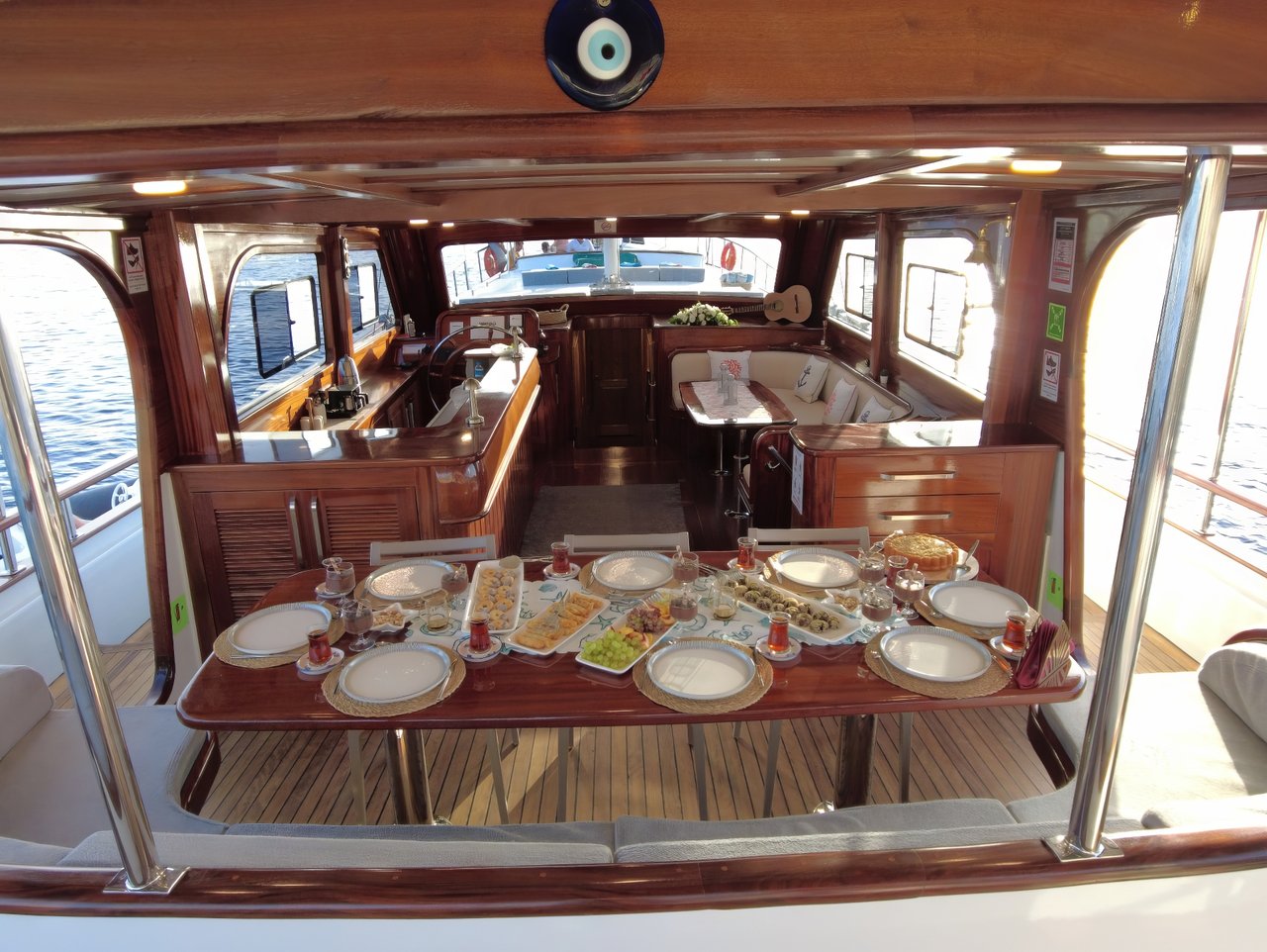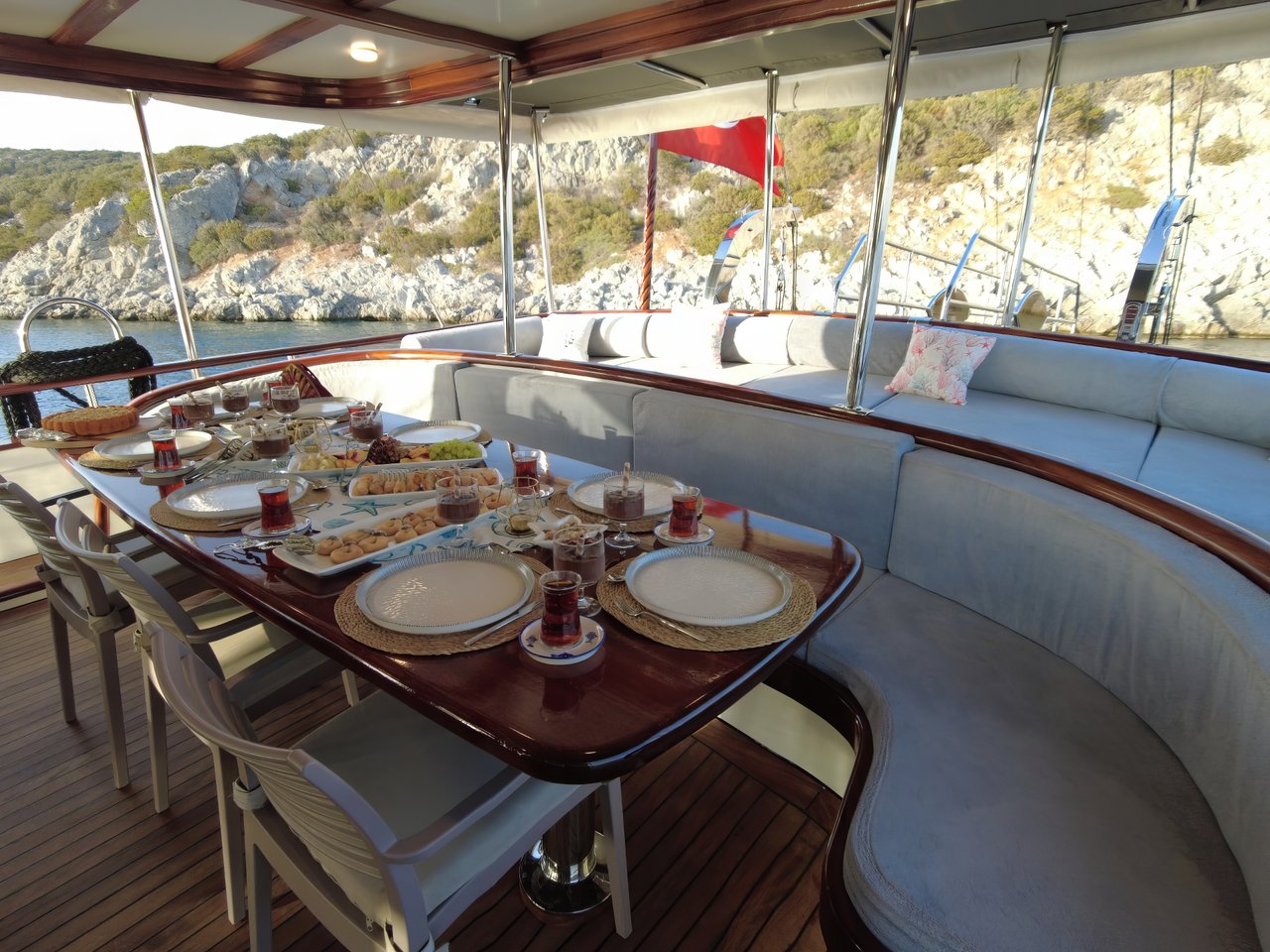 Every detail aboard SU PERISI C is designed for guest comfort and convenience. Her fully air-conditioned interiors ensure cool respite from the Mediterranean sun, while a professional 4-person crew ensures attentive service at all times. Guests can relax, dine, and unwind knowing every detail is taken care of with Turkish hospitality.