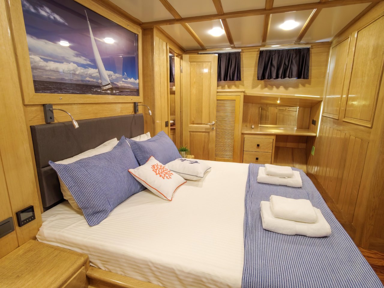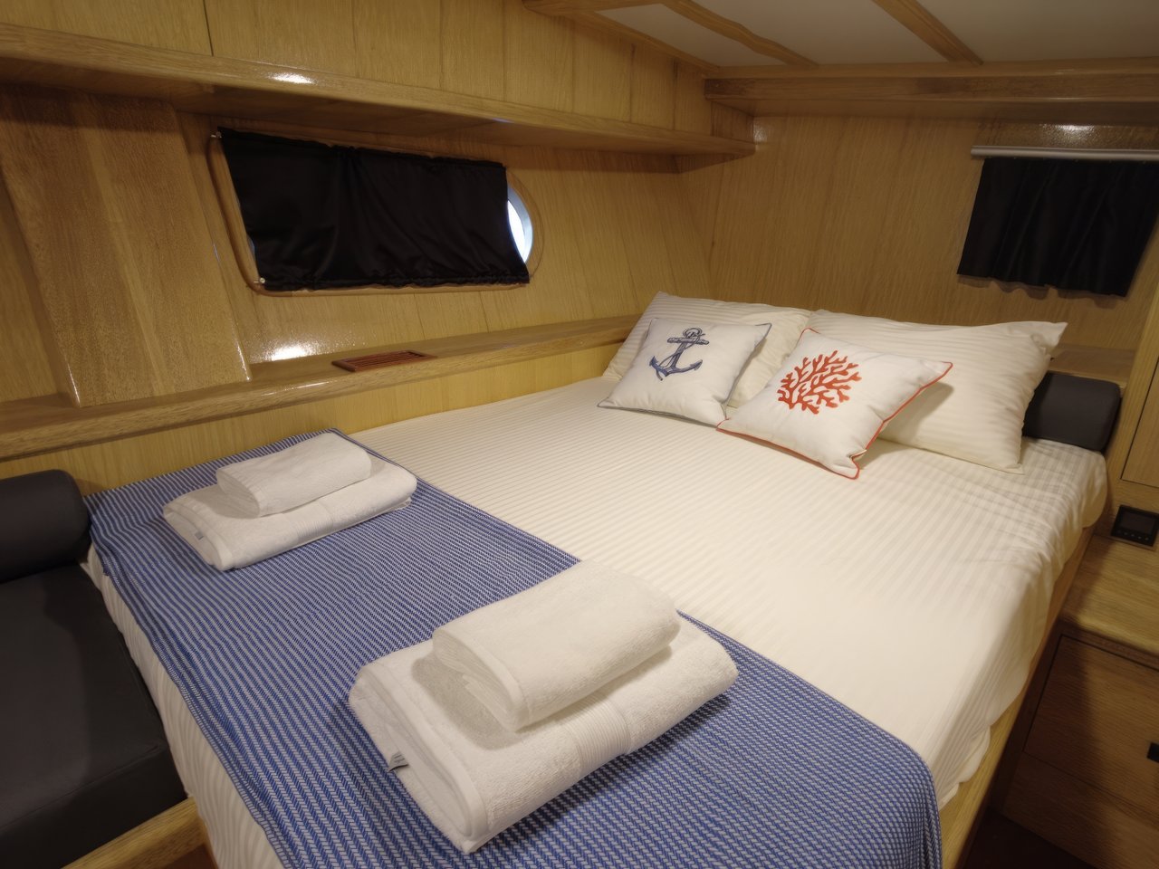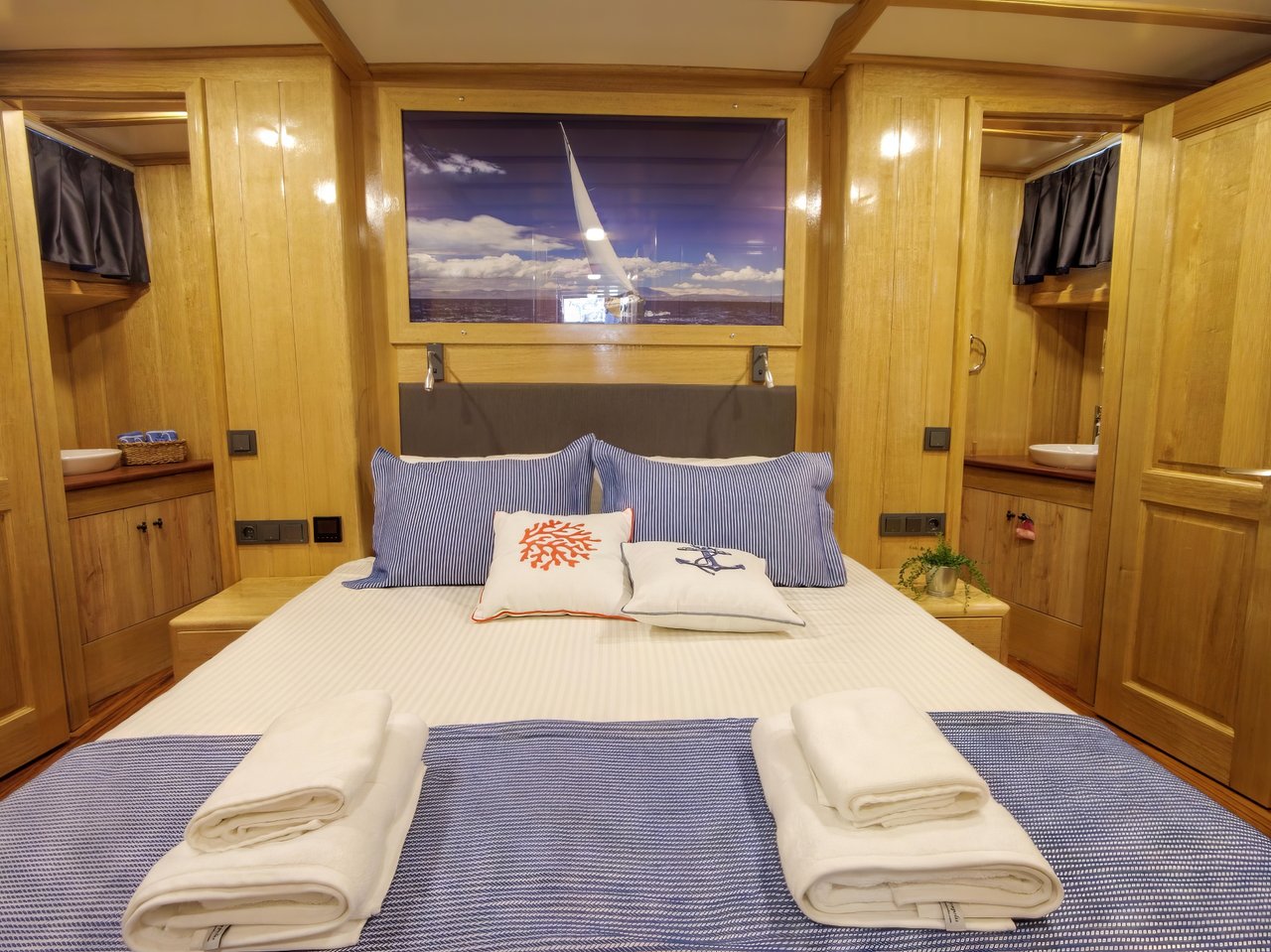 Built as a traditional-style wooden gulet with modern enhancements, SU PERISI C combines stability, smooth motion, and a spacious layout for an enjoyable cruise. With a beam of 6.2m, she provides excellent balance even in open waters, while her 12-knot speed ensures relaxed yet efficient travel between destinations. Perfect for coastal exploration, she offers a refined charter experience rooted in classic Turkish design.