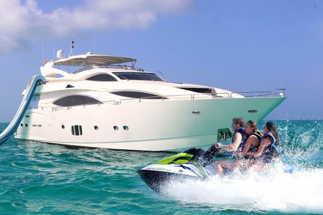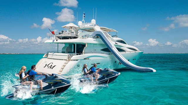 Available for charter in the Bahamas, Miami, and Florida • Expansive deck areas with Jacuzzi and sunbathing zones • Wide array of water toys including SeaBobs, waterslide, and waverunners • 5 stylish cabins accommodating up to 12 guests • Wi-Fi connectivity and air conditioning throughout • 32m Sunseeker motor yacht with planing hull