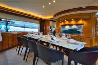 In total, the bed configuration includes 1 king, 2 queens, 4 singles, and 2 Pullmans. Each cabin is fitted with individual TVs, satellite access, and air conditioning for a relaxing and private retreat. She also accommodates up to 5 crew members onboard, ensuring a seamless and luxurious yacht charter experience.