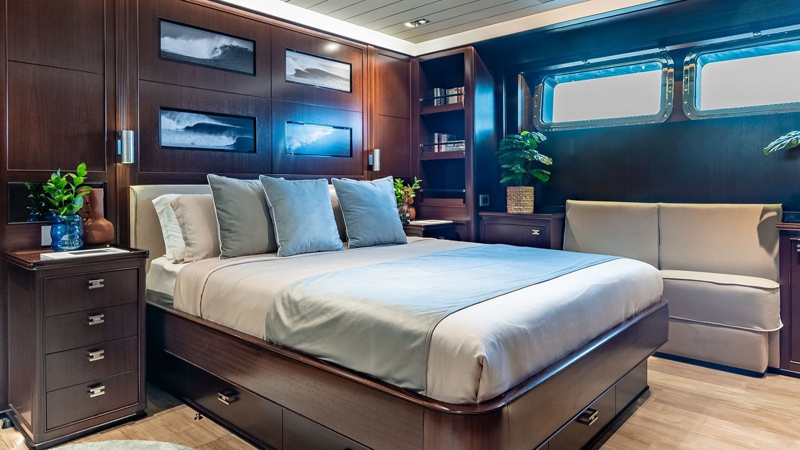 GALILEO welcomes up to 12 guests in six beautifully appointed suites, each featuring elegant natural finishes, ensuite bathrooms, and a peaceful atmosphere suited for relaxation after a day of adventure. Designed with comfort and privacy in mind, her sleeping arrangements cater seamlessly to families, couples, private groups, or wellness-focused retreats.